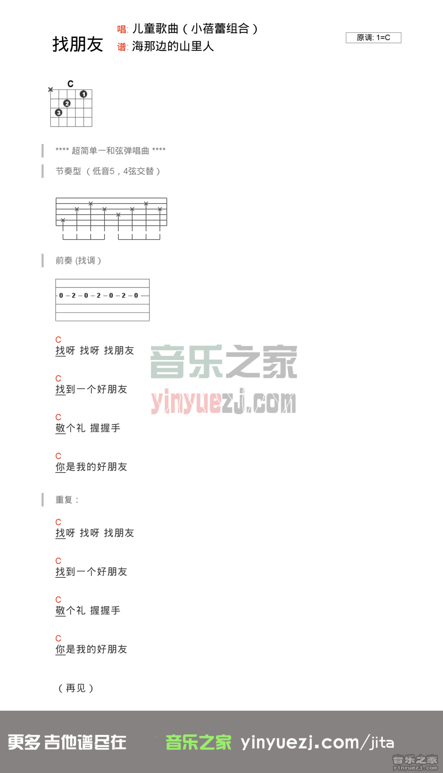 曲谱介绍: C调版 儿歌《找朋友》吉他和弦弹唱谱