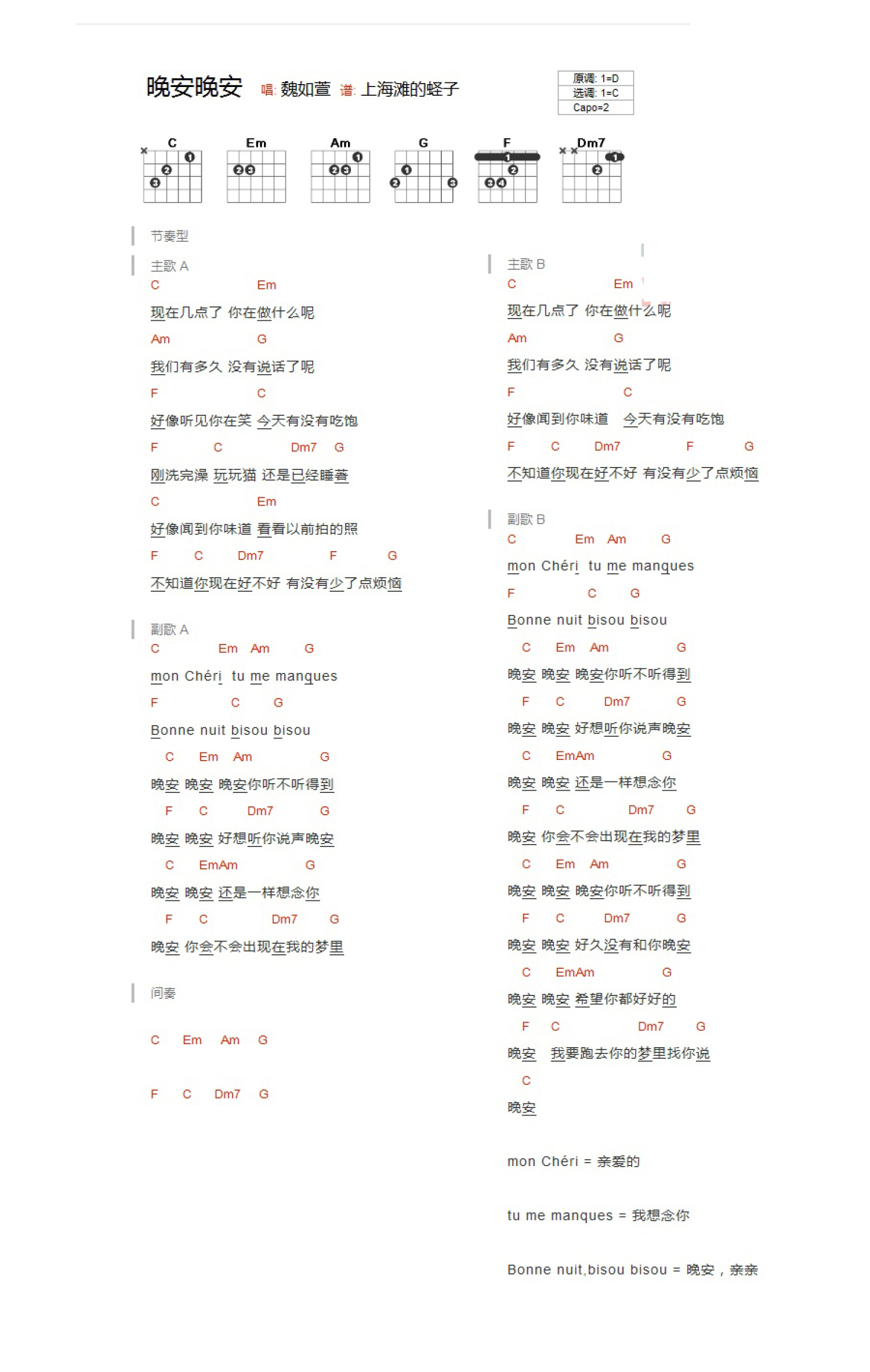 曲谱介绍: C调版 魏如萱《晚安晚安》吉他和弦弹唱谱