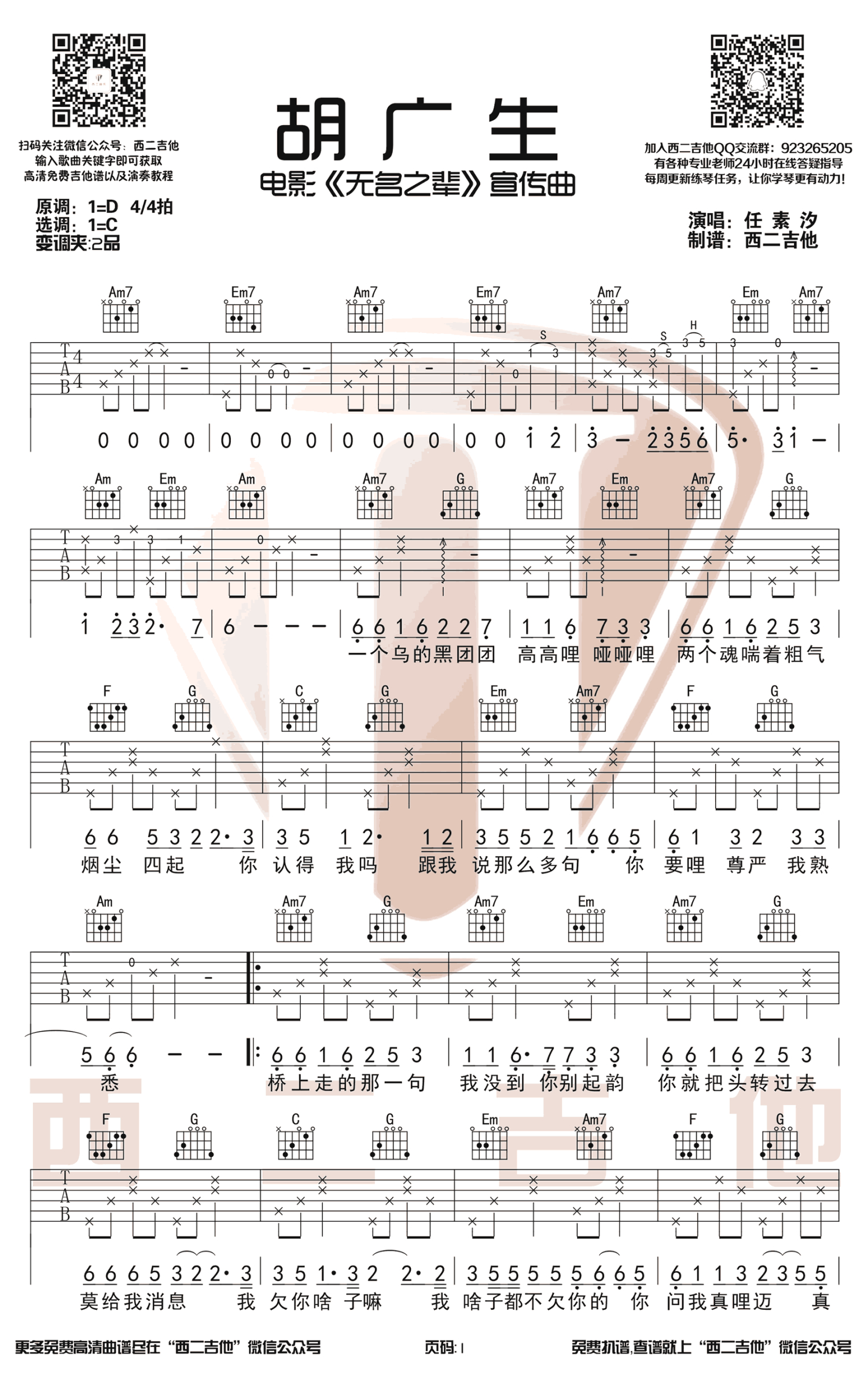 胡广生吉他谱 - 任素汐 - C调吉他弹唱谱 - 女生版