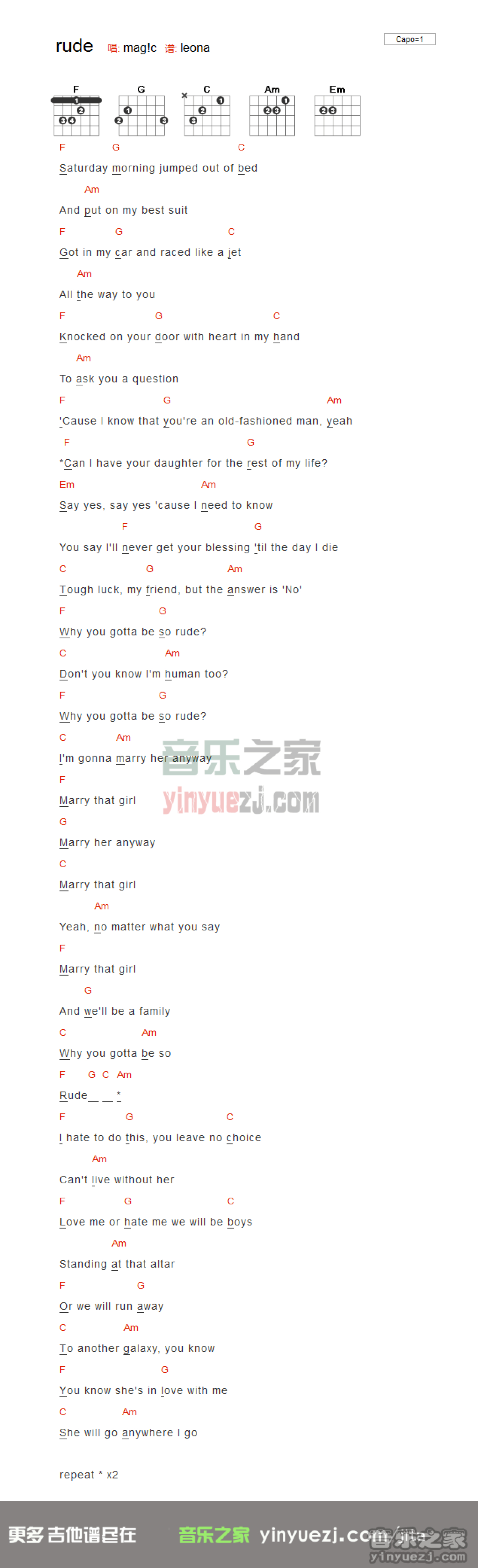 曲谱介绍: MAGIC《Rude》吉他和弦弹唱谱