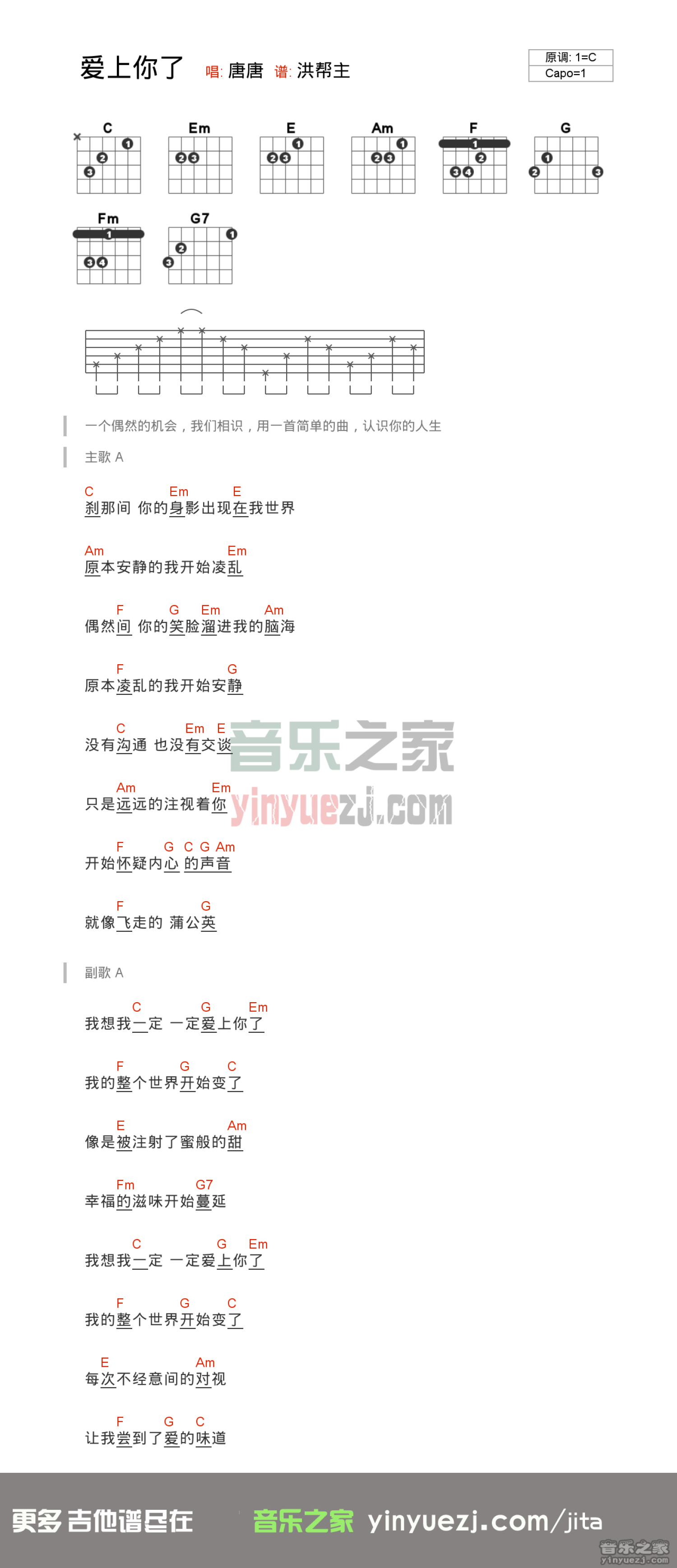 曲谱介绍: C调版唐唐《爱上你了》吉他和弦弹唱谱