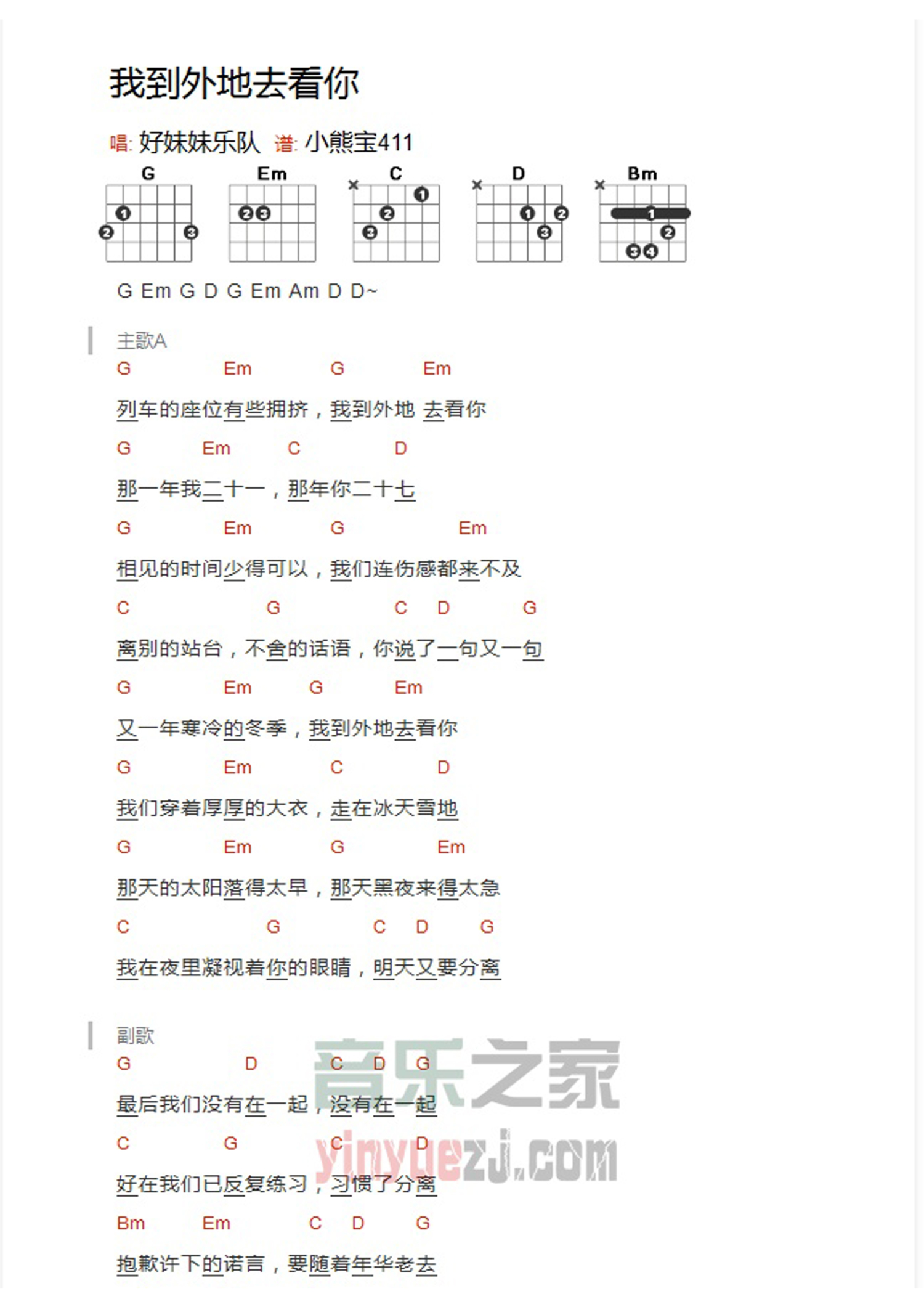 曲谱介绍: 好妹妹乐队《我到外地去看你》吉他和弦弹唱谱
