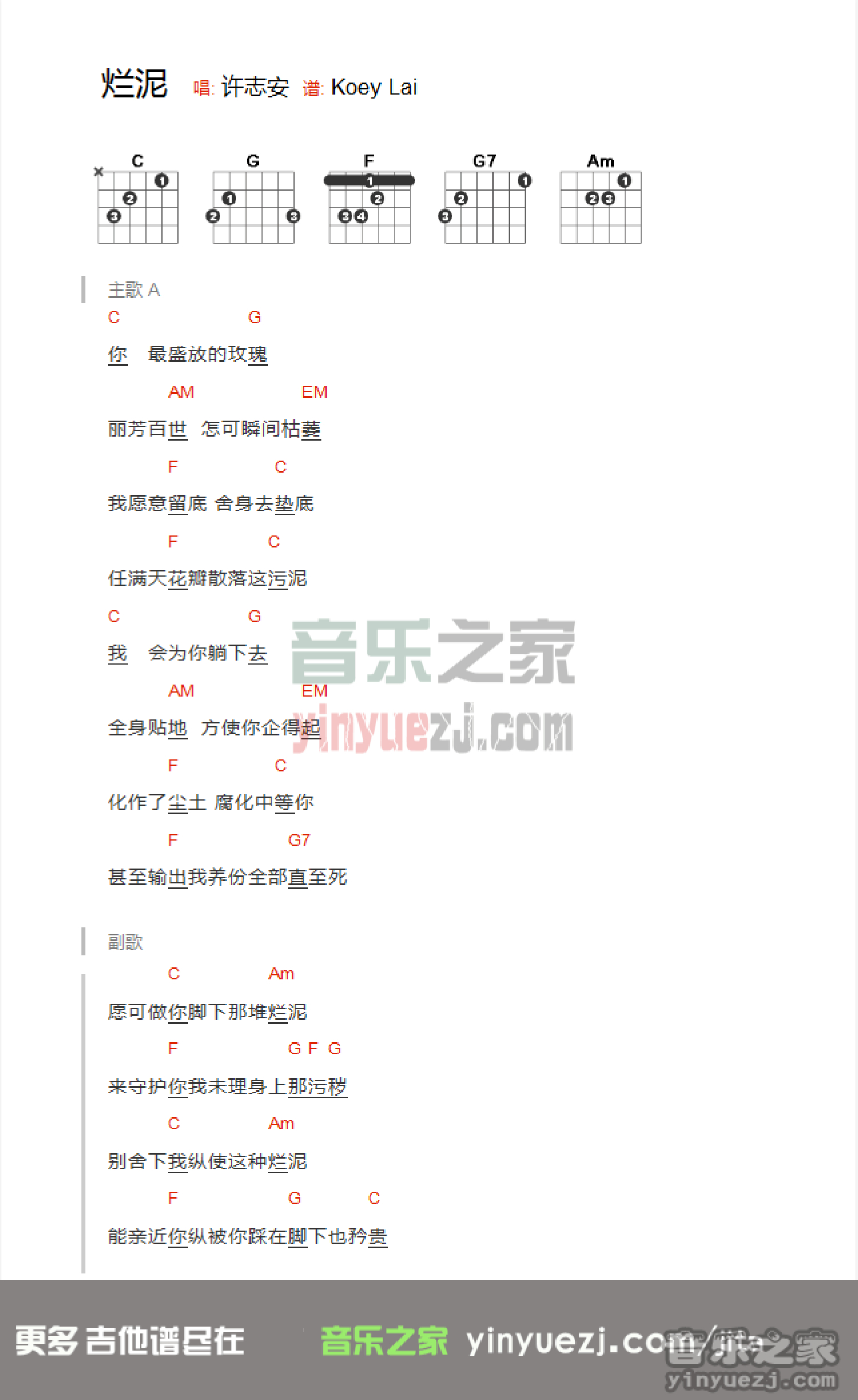 曲谱介绍: 许志安《烂泥》吉他和弦弹唱谱