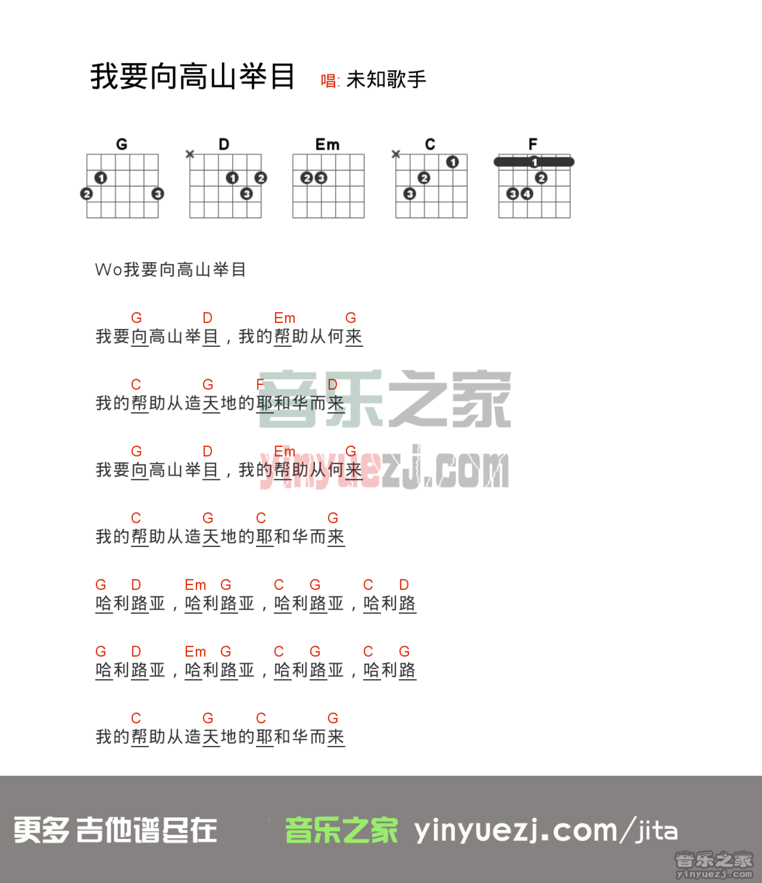 曲谱介绍: 赞美之泉《我要向高山举目》吉他和弦弹唱谱