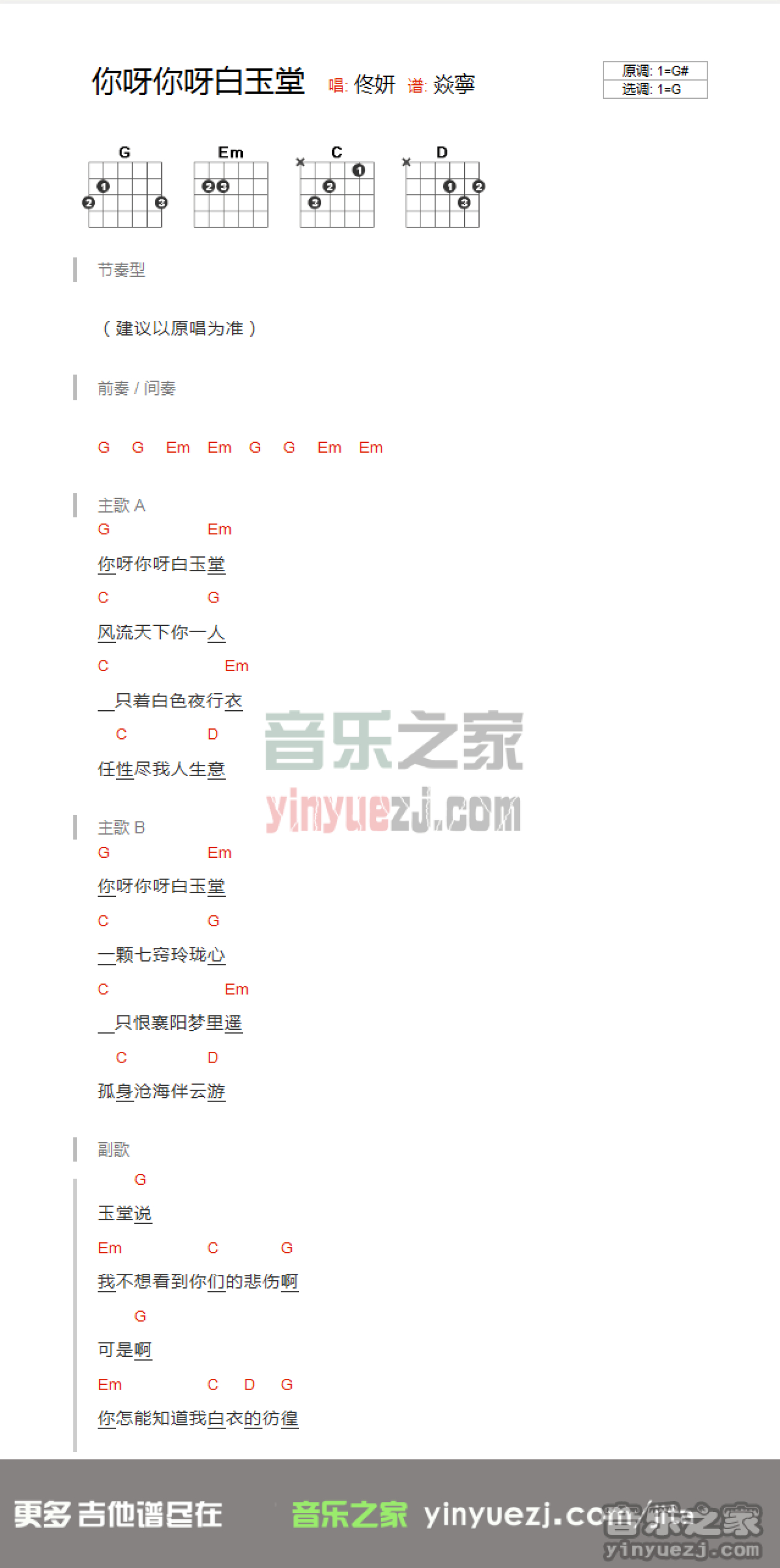 曲谱介绍: G调版佟妍《你呀你呀白玉堂》吉他和弦弹唱谱