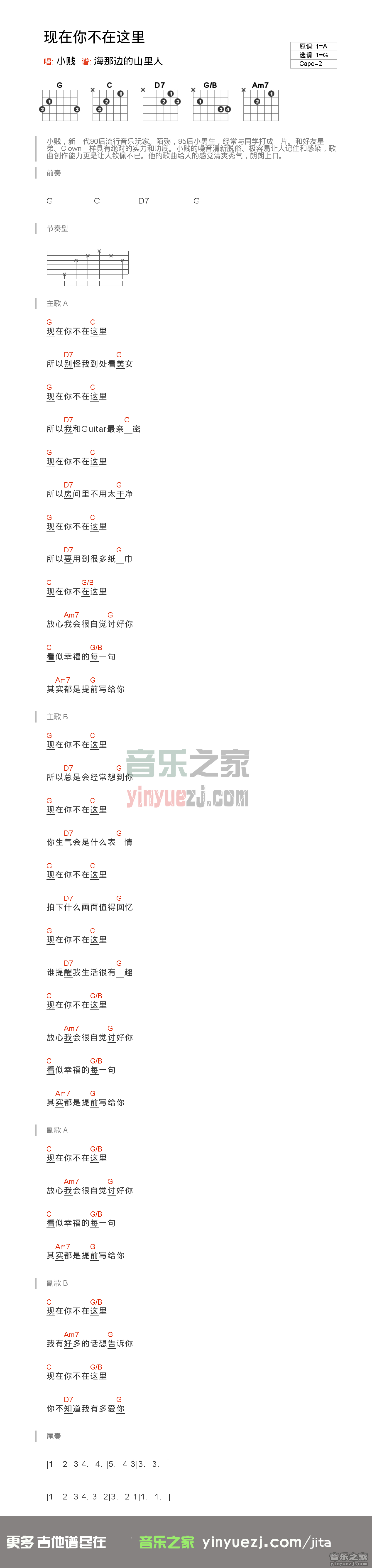 曲谱介绍: G调版小贱《现在你不在这里》吉他弹唱六线谱