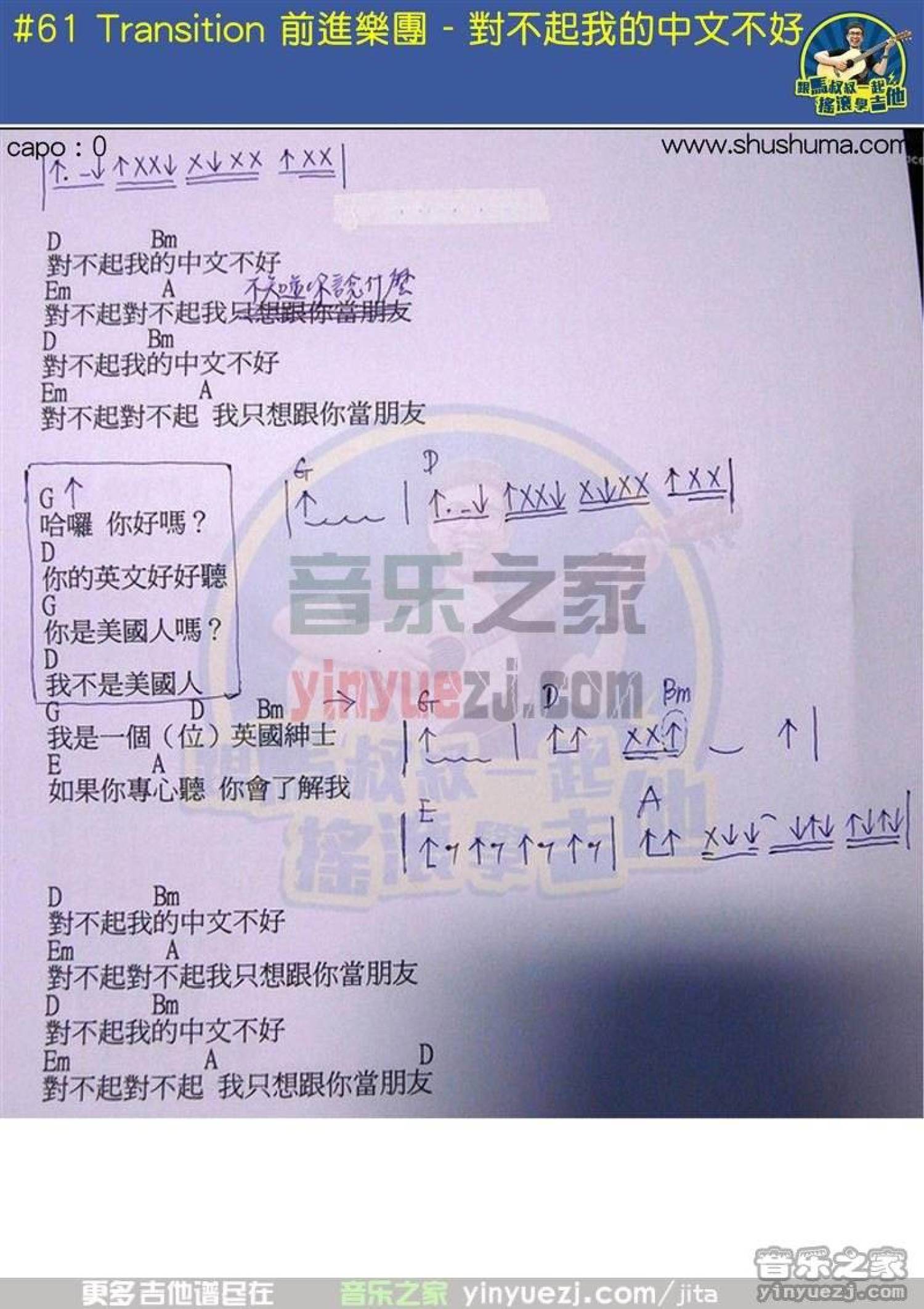 曲谱介绍: 马叔叔版《对不起我的中文不好》吉他弹唱谱