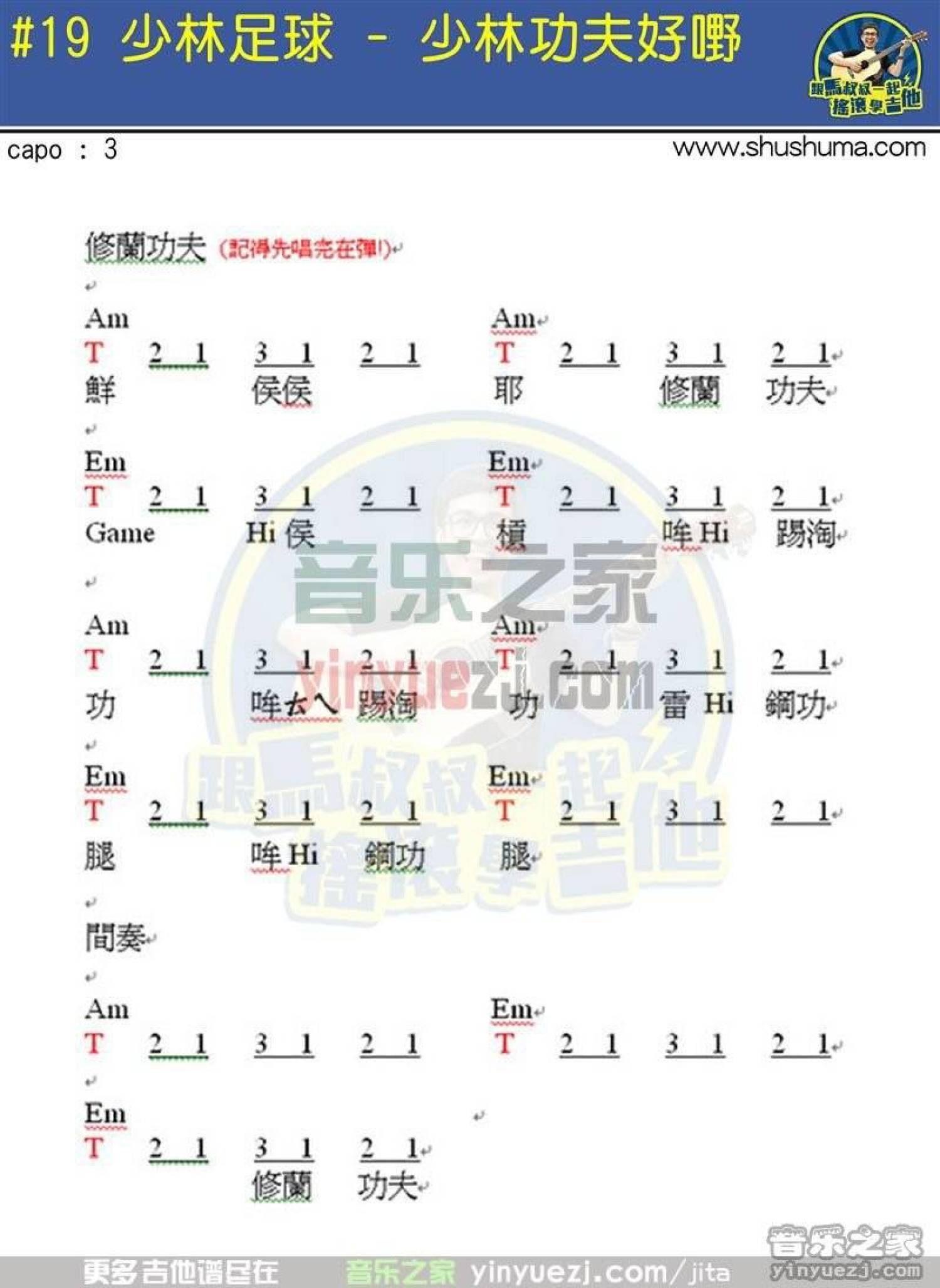 曲谱介绍: 马叔叔版少林足球《少林功夫好耶》吉他弹唱谱