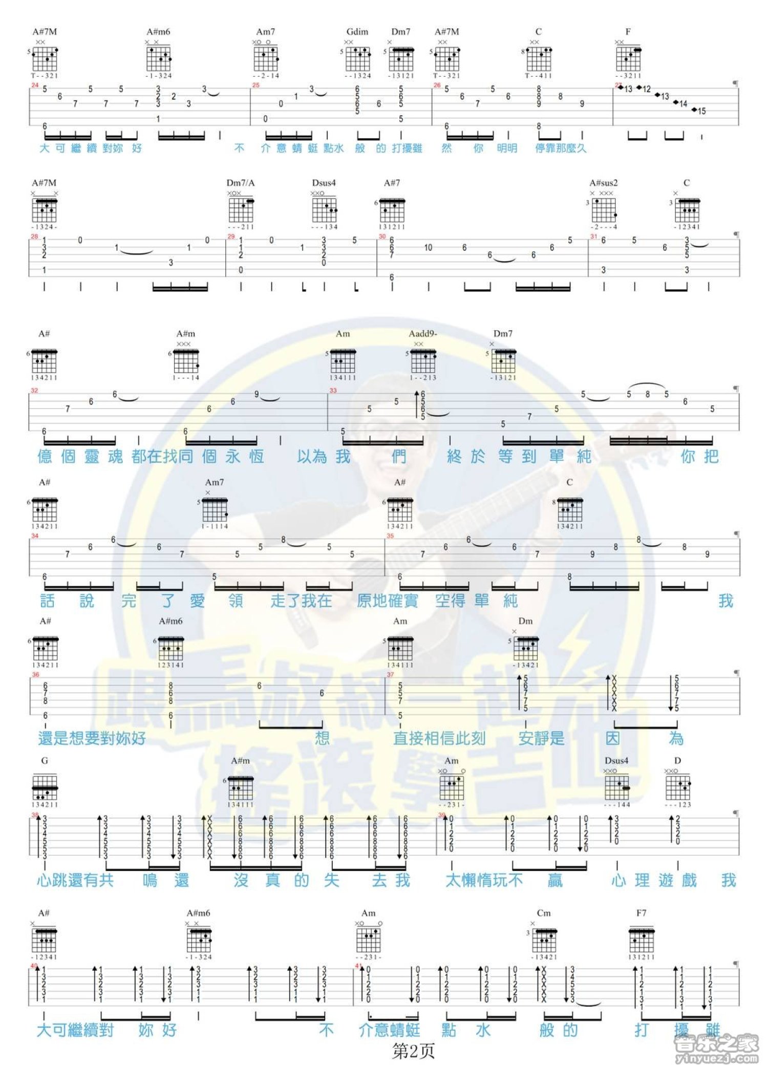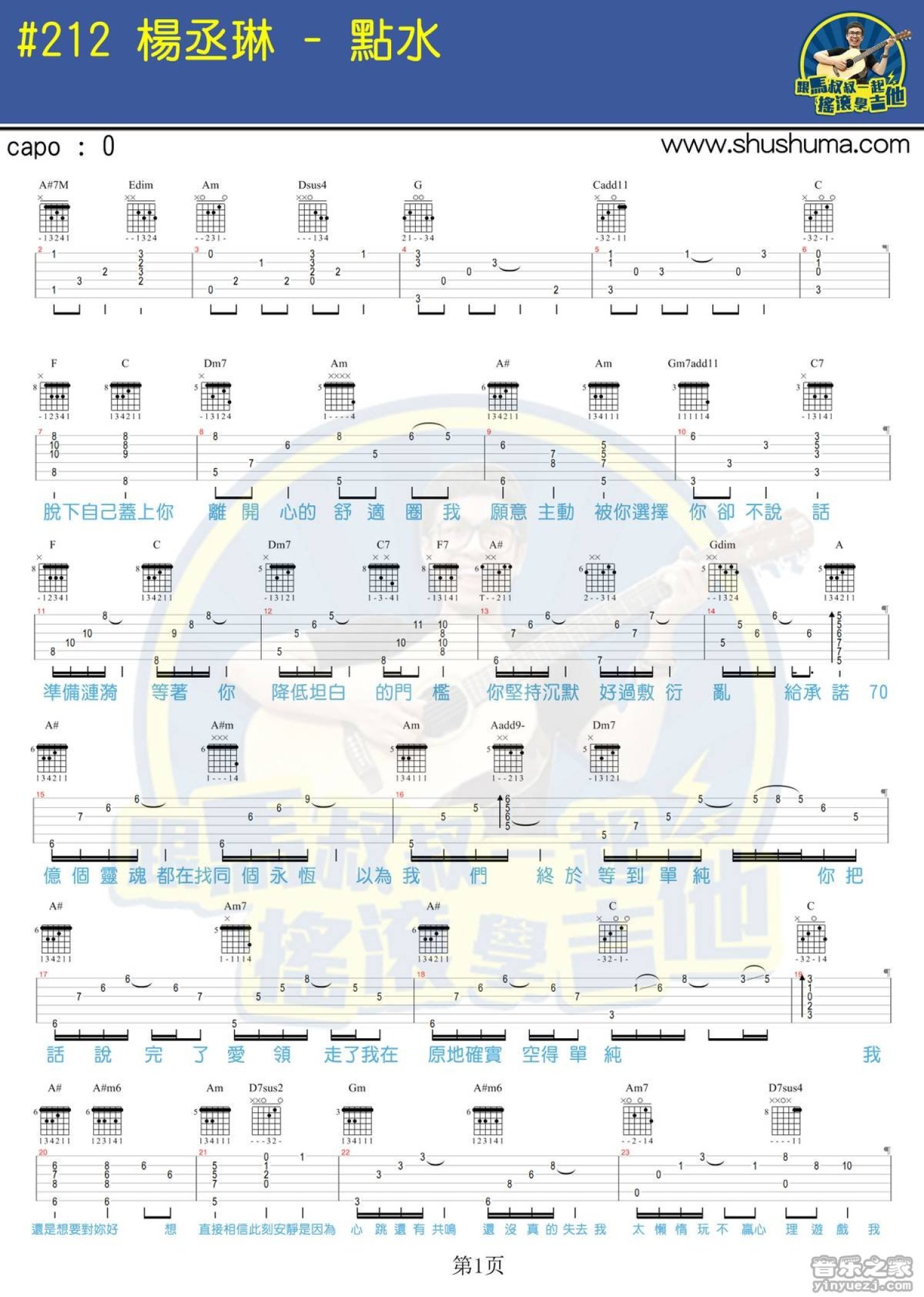 曲谱介绍: 马叔叔版杨丞琳《点水》吉他弹唱六线谱