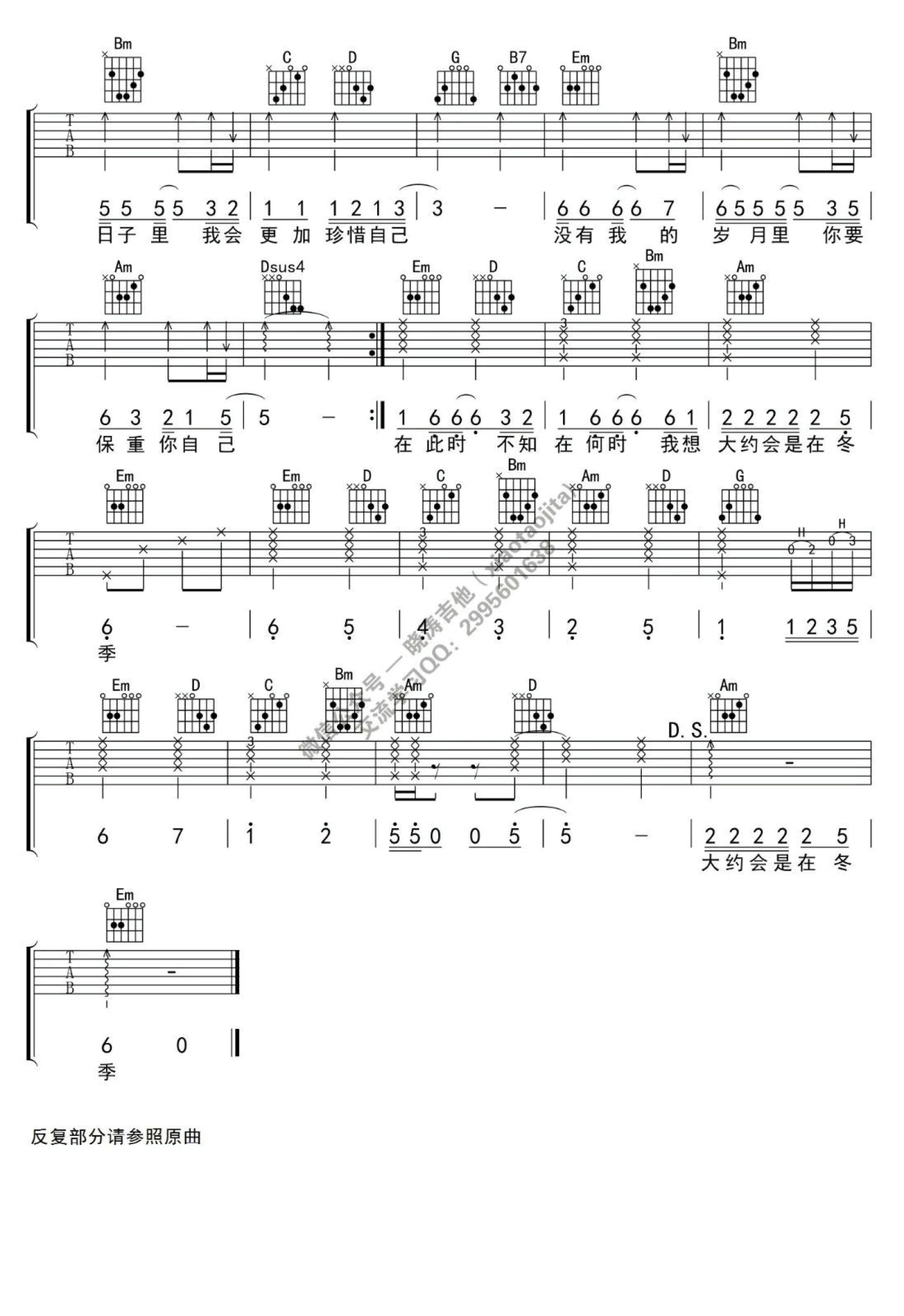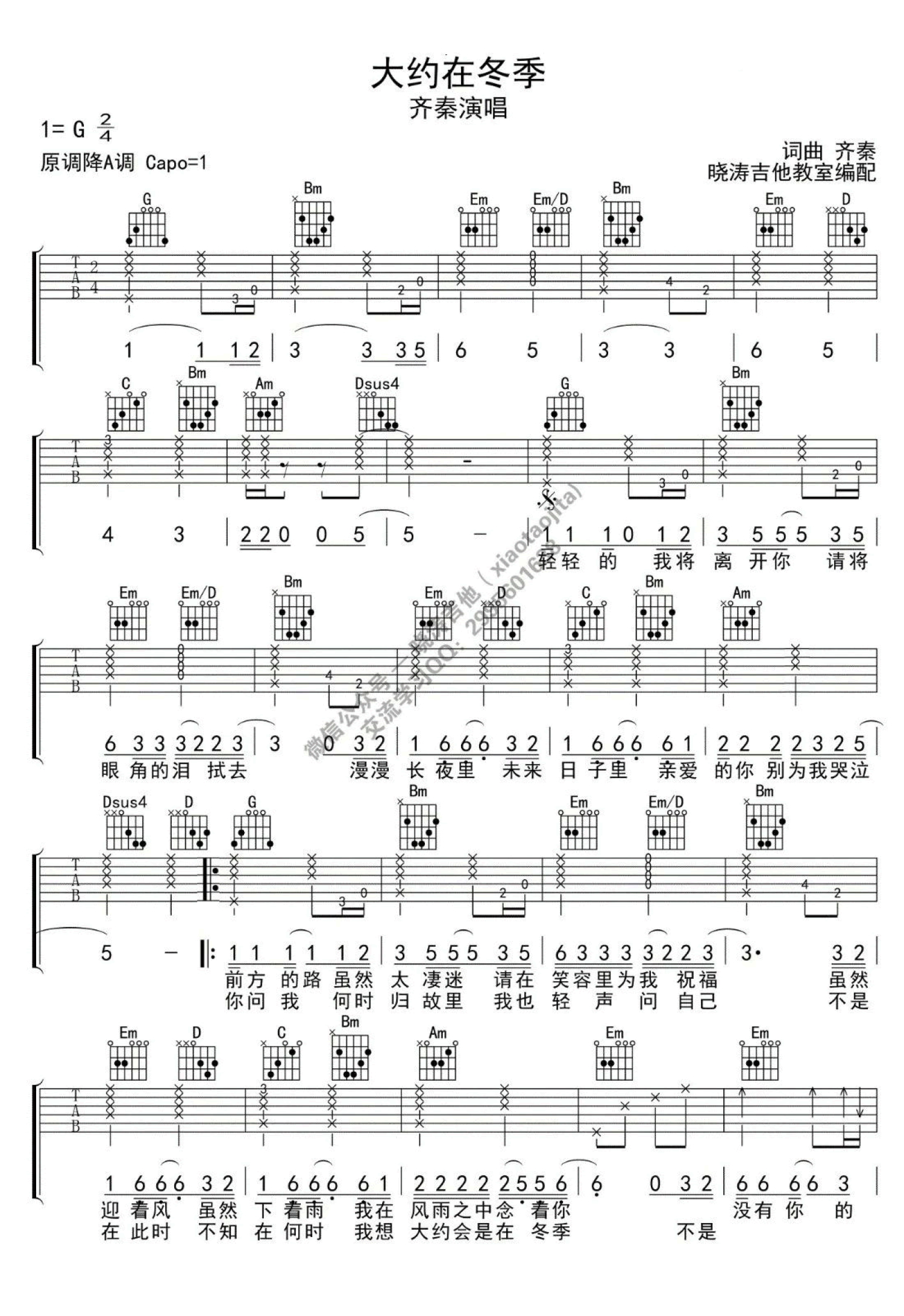 曲谱介绍: 原调降A,选用G调指法,CAPO夹一品。齐秦的一首怀旧经典情歌,大约在冬季六线谱,并为同学们带来曲谱配套的吉他弹唱教学视频,打谱啦网更新分享。这首老歌当年不知温暖了多少人的心,在这个寒冷的冬季,借助这首歌给大家送去最温暖的祝福!