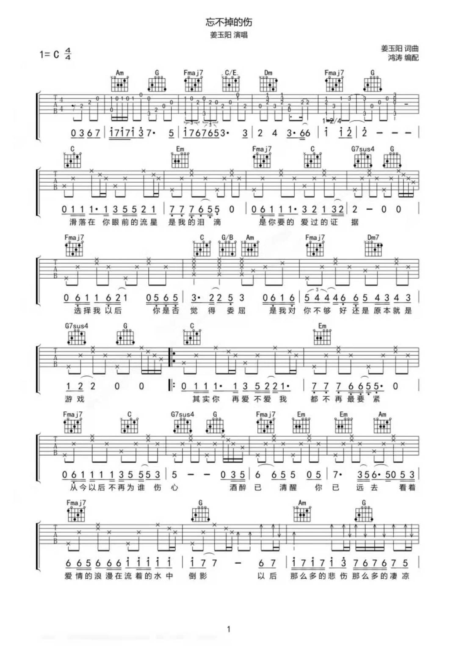 曲谱介绍: 姜玉阳《忘不掉的伤》吉他谱_C调吉他弹唱谱