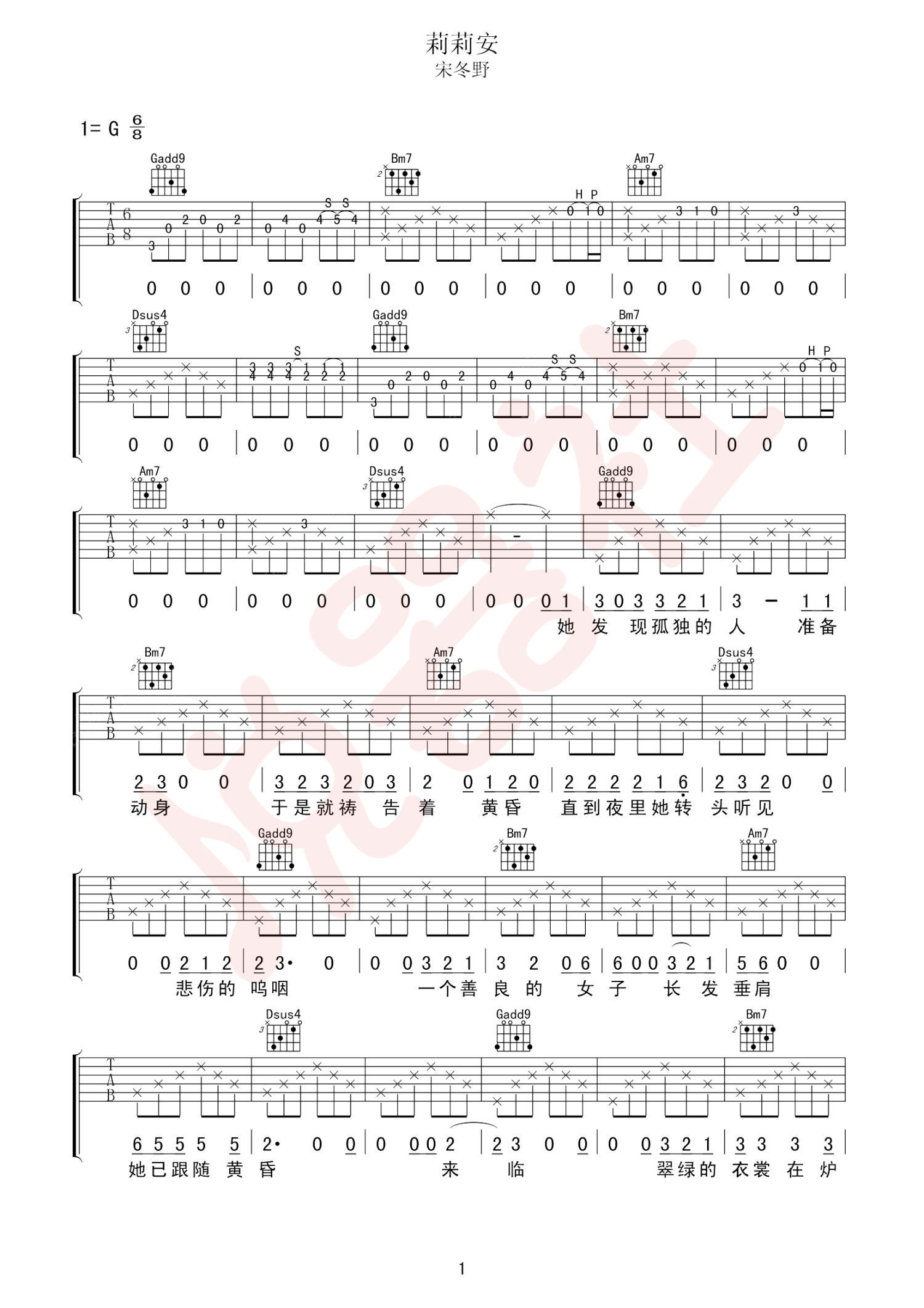 曲谱介绍: 宋冬野《莉莉安》吉他谱_G调吉他弹唱谱