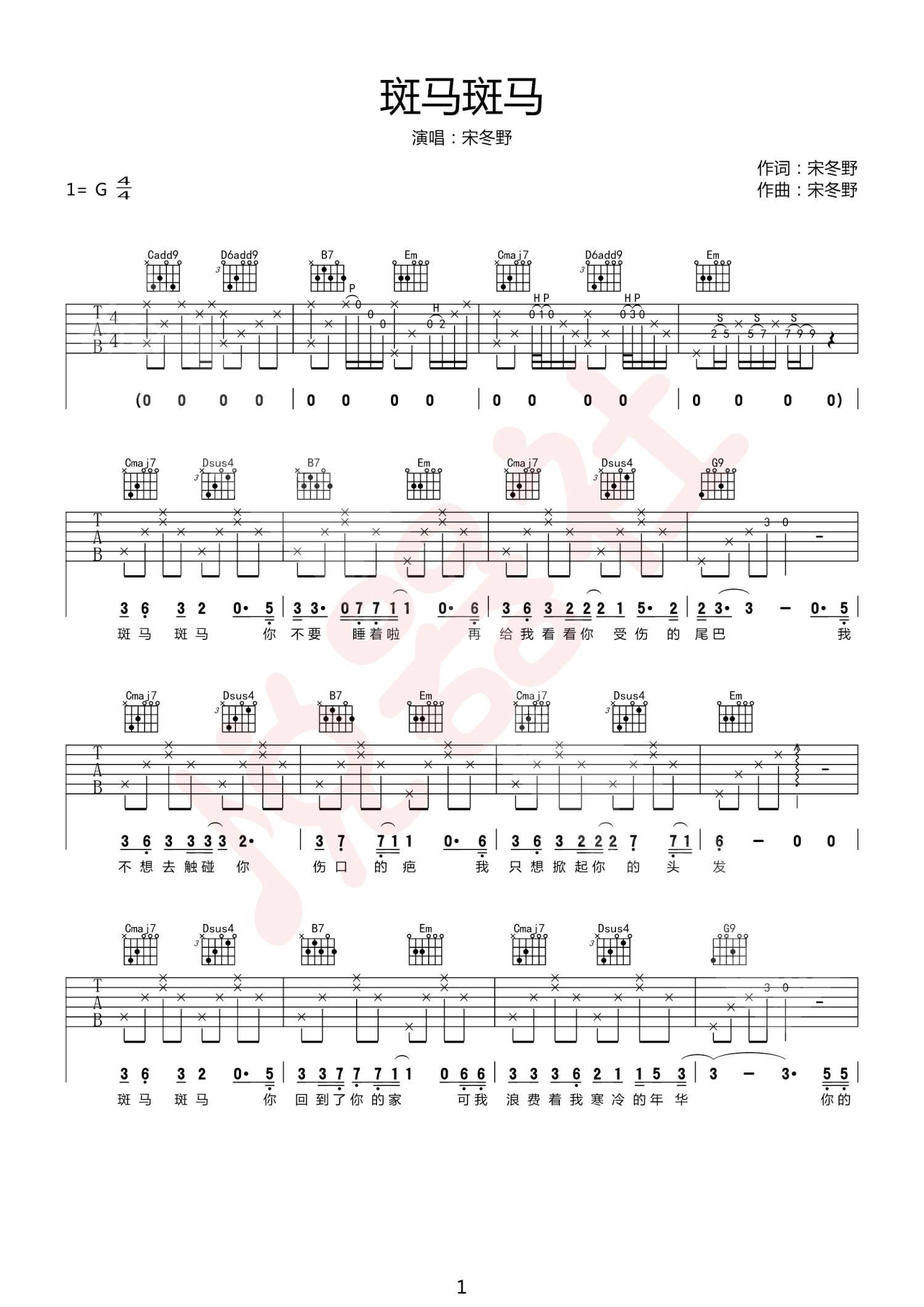 斑马斑马吉他谱 - 宋冬野 - G调吉他弹唱谱