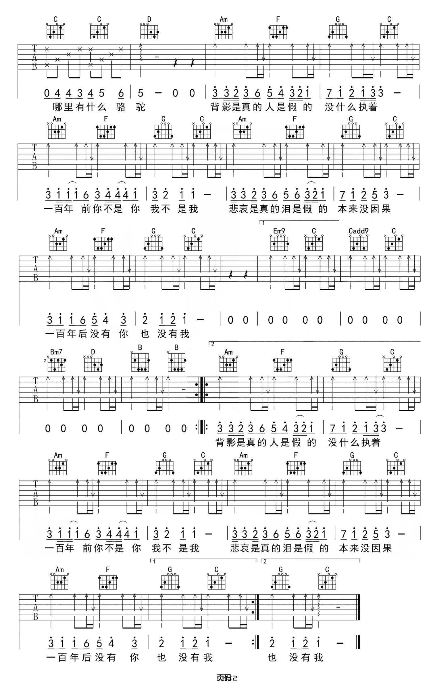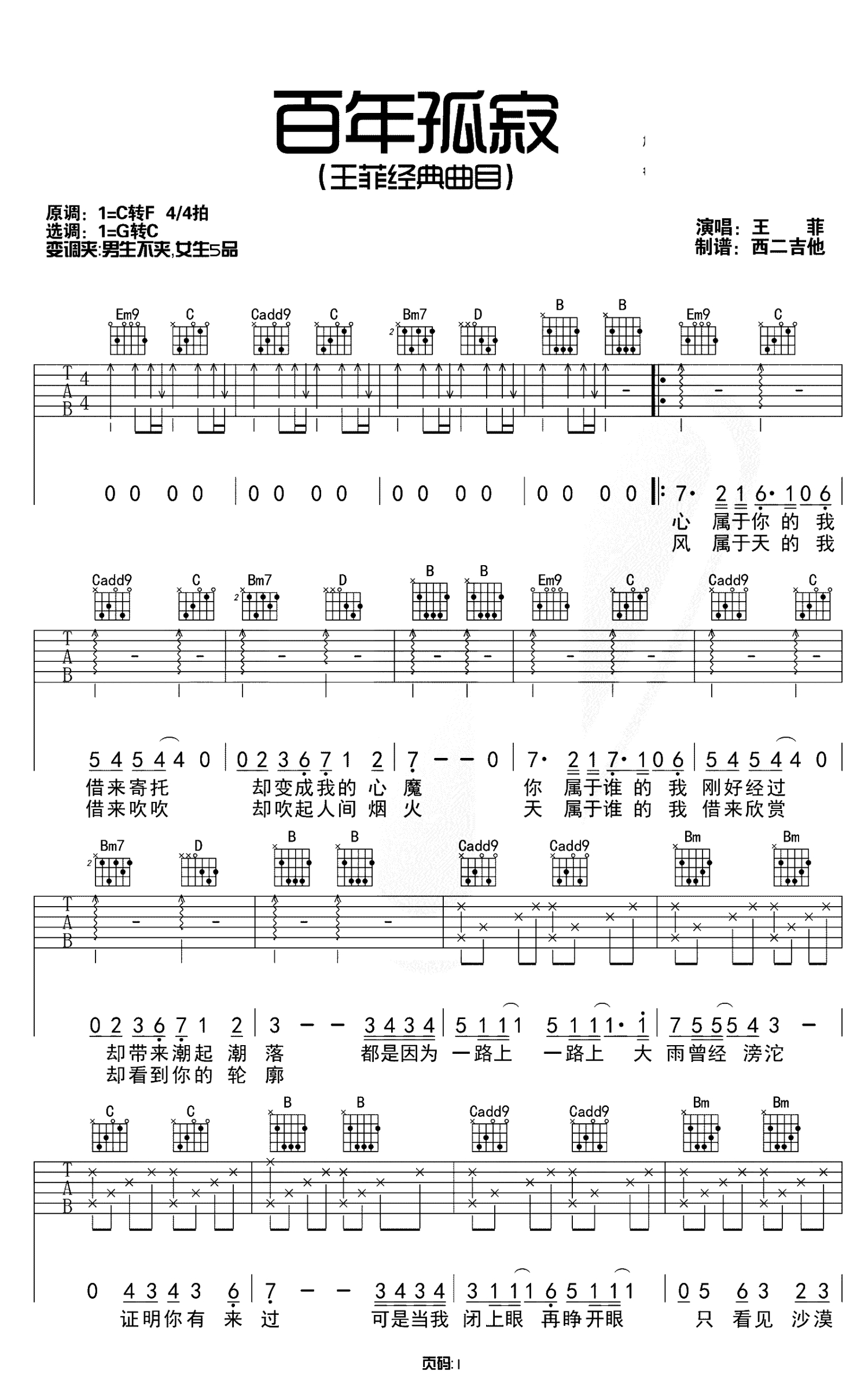曲谱介绍: 王菲《百年孤寂》吉他谱,G转C调,变调夹男生不夹,女生夹五品。女神王菲非常经典的一首歌,主歌部分是一个调,副歌部分是另一个调,这种变调方式使得演唱起来更有冲击力,如果你没有听过这首歌,我推荐你听一下,绝对不会失望,如果你听过这首歌,那就拿着谱子练练吧!