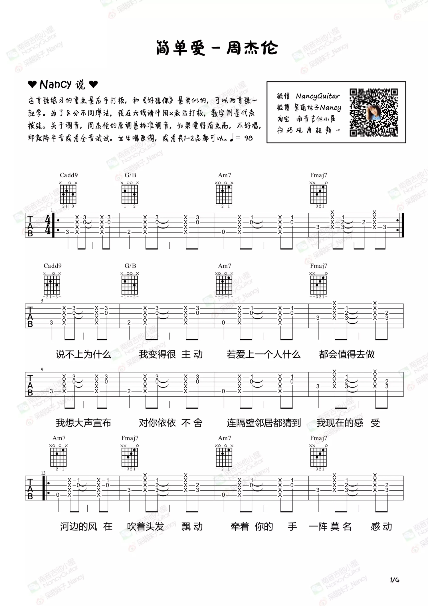 曲谱介绍: 周杰伦《简单爱》吉他谱_吉他弹唱谱