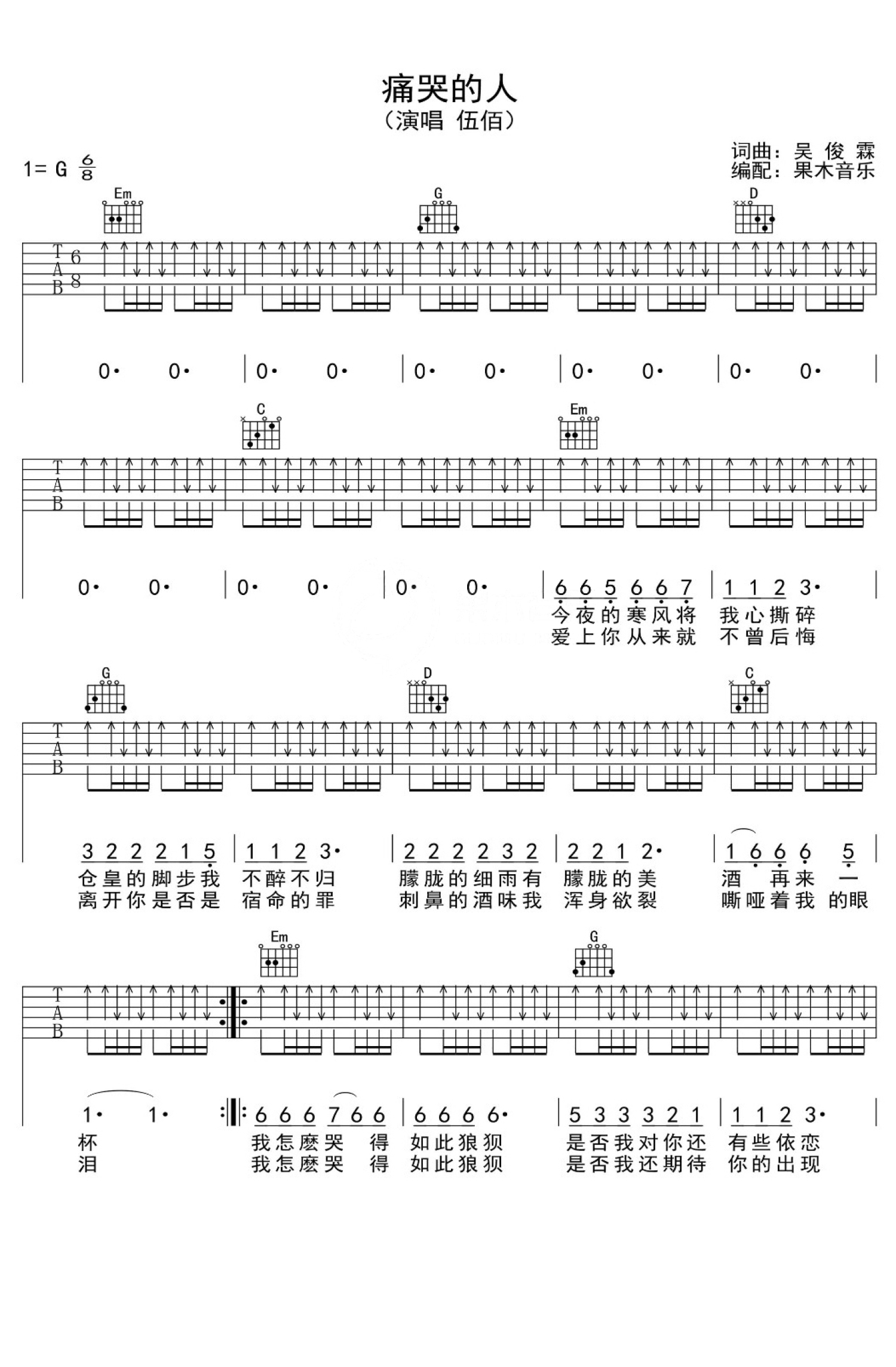 曲谱介绍: 伍佰《痛哭的人》吉他谱_G调吉他弹唱谱