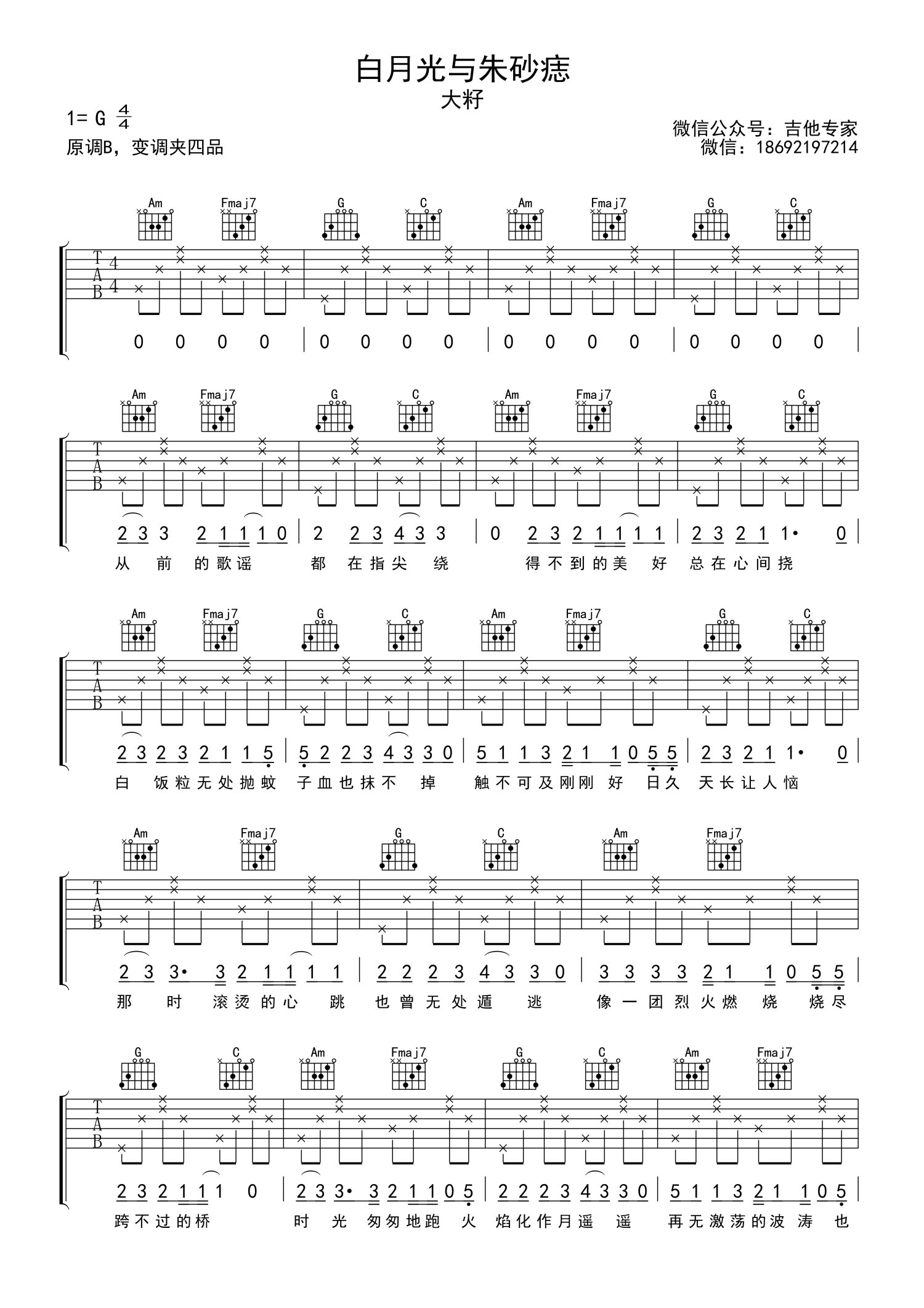 曲谱介绍: 大籽《白月光与朱砂痣》吉他谱_G调吉他弹唱谱_简单版