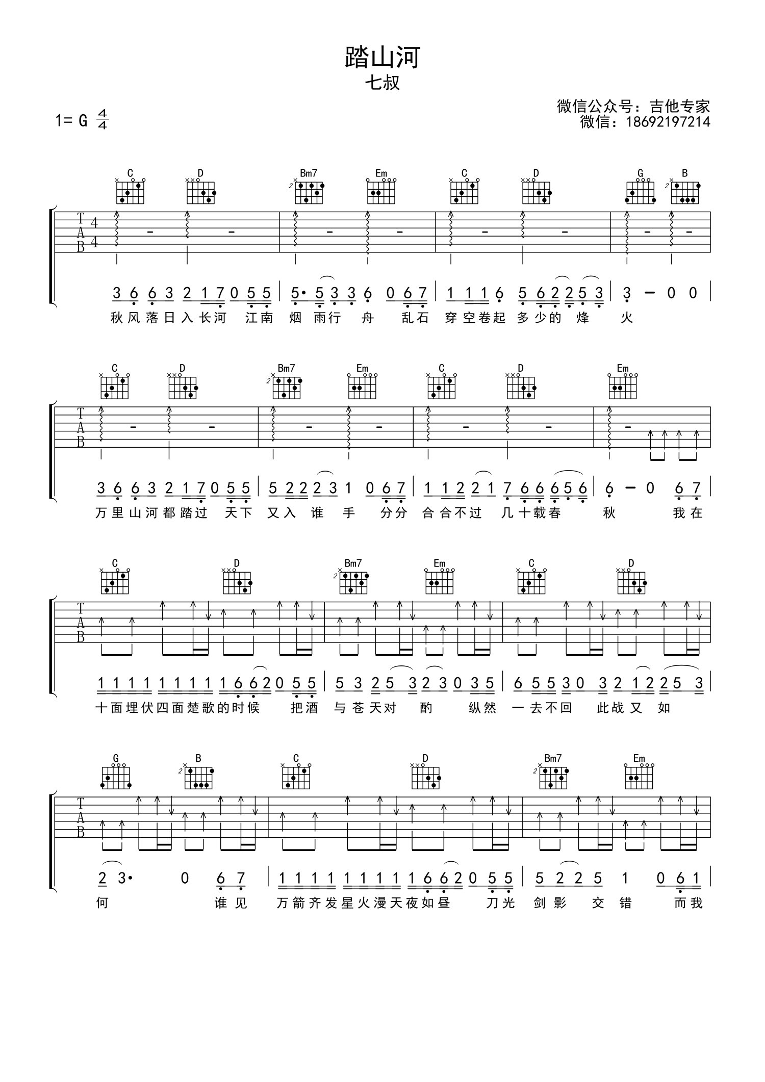 曲谱介绍: 是七叔呀《踏山河》吉他谱_G调吉他弹唱谱