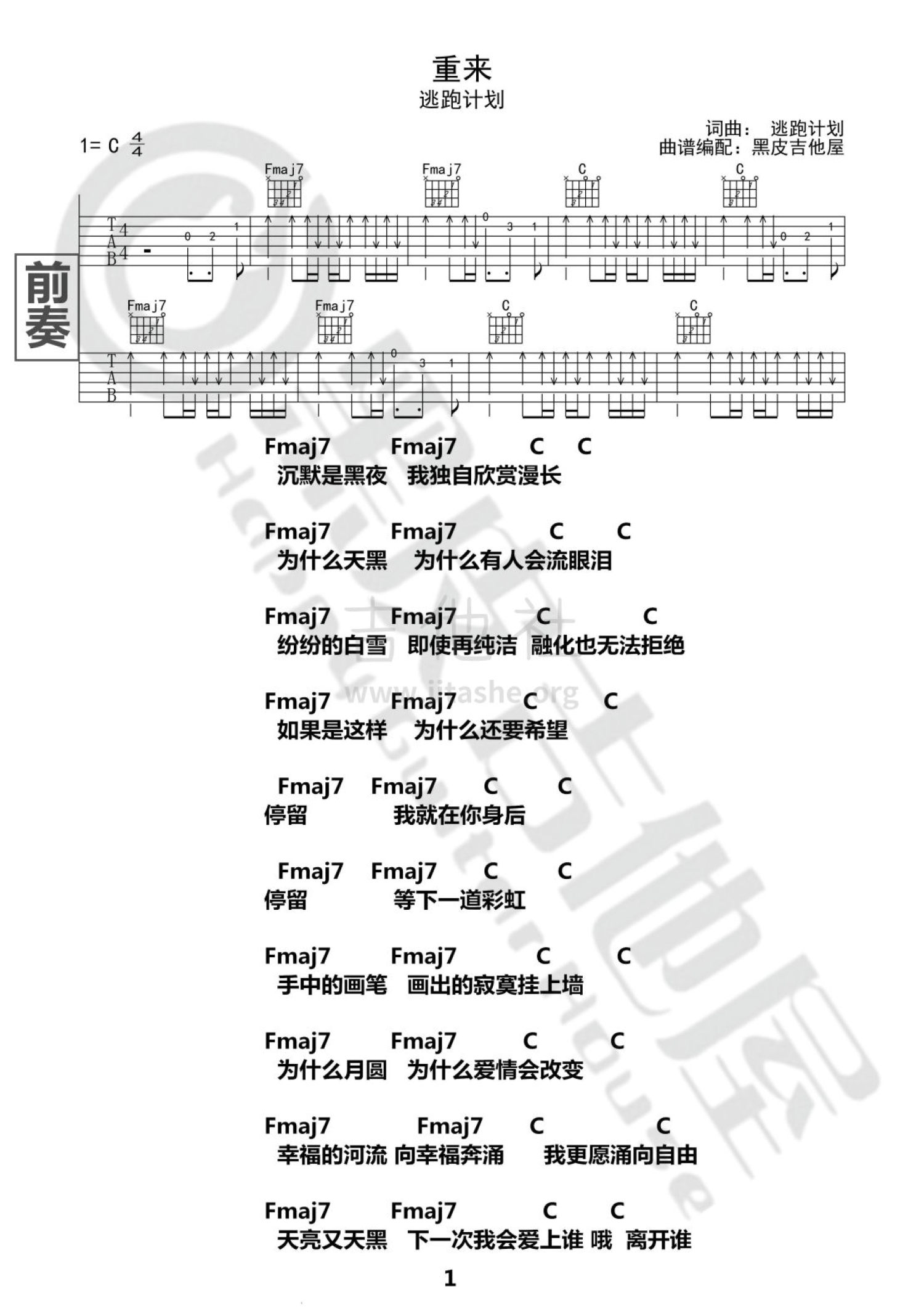 曲谱介绍: 逃跑计划《重来》吉他谱_C调吉他弹唱谱_和弦谱