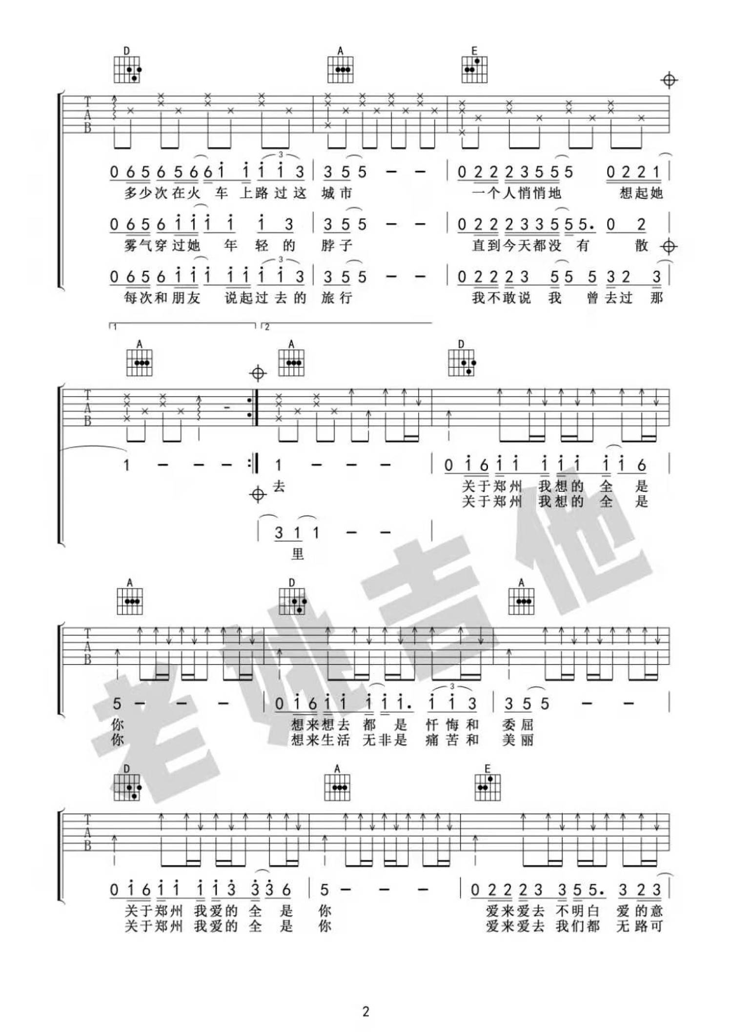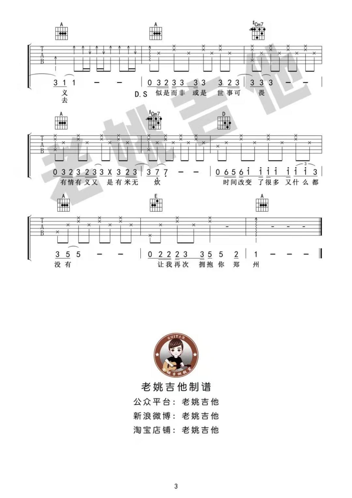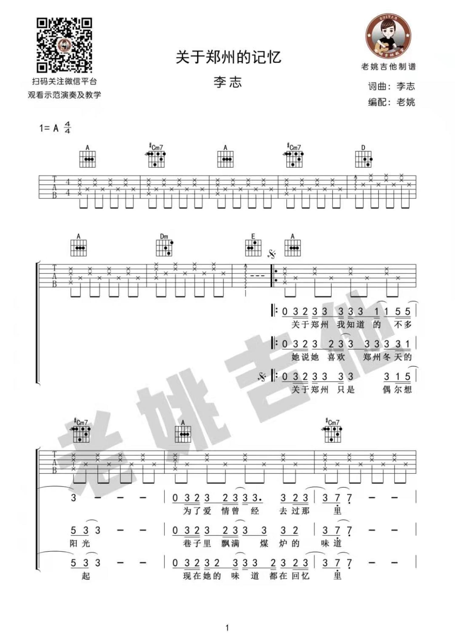 曲谱介绍: 李志《关于郑州的记忆》吉他谱_A调吉他弹唱谱
