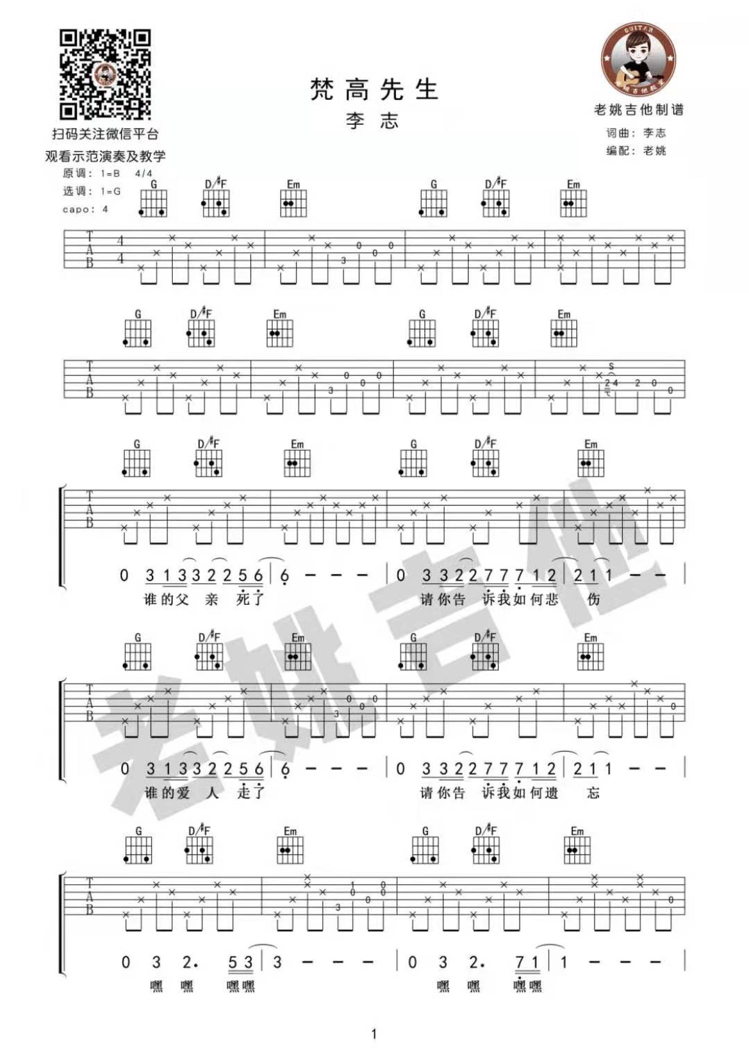 曲谱介绍: 李志《梵高先生》吉他谱_G调吉他弹唱谱