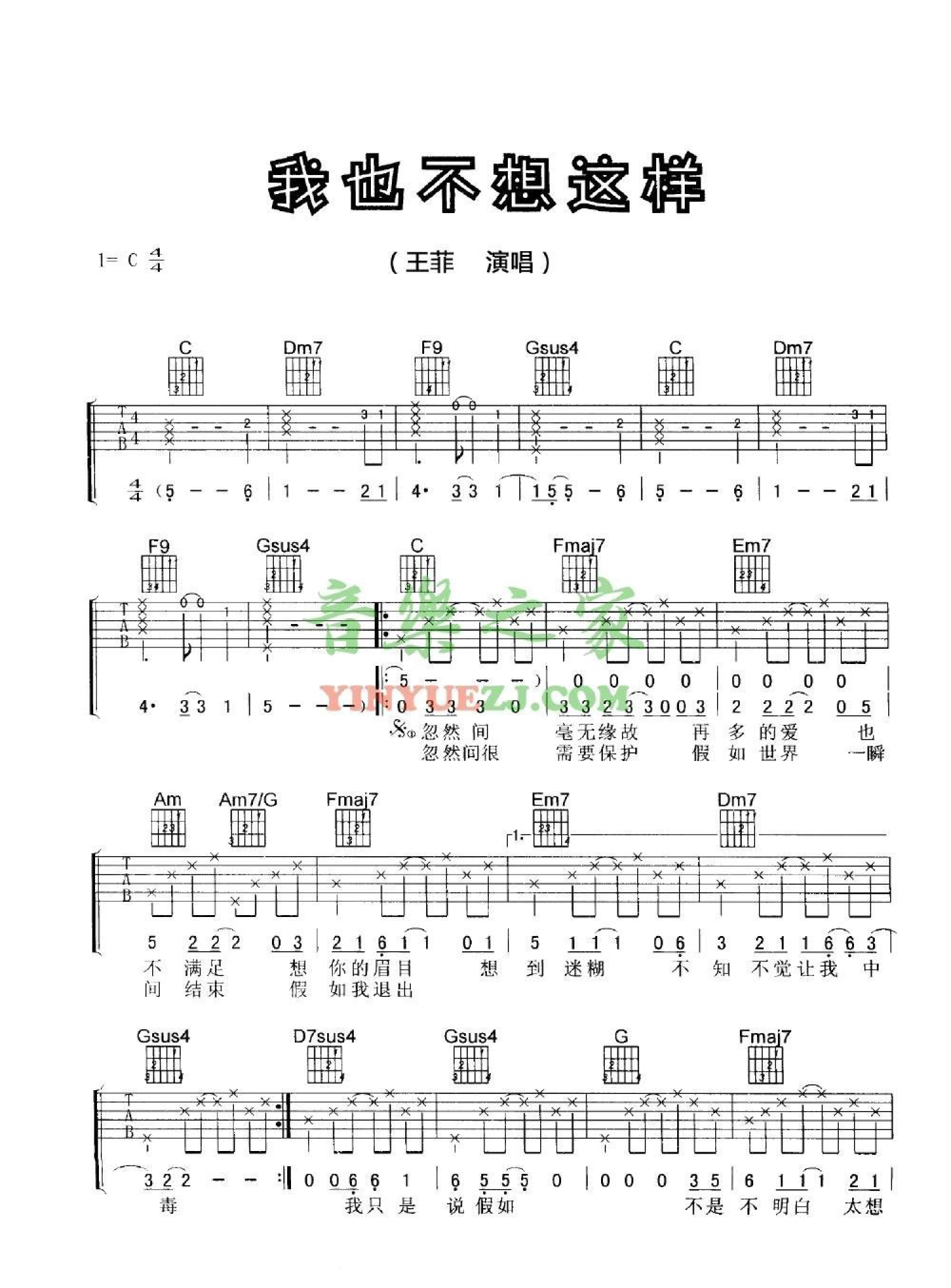 曲谱介绍: 王菲《我也不想这样》吉他谱_C调吉他弹唱谱