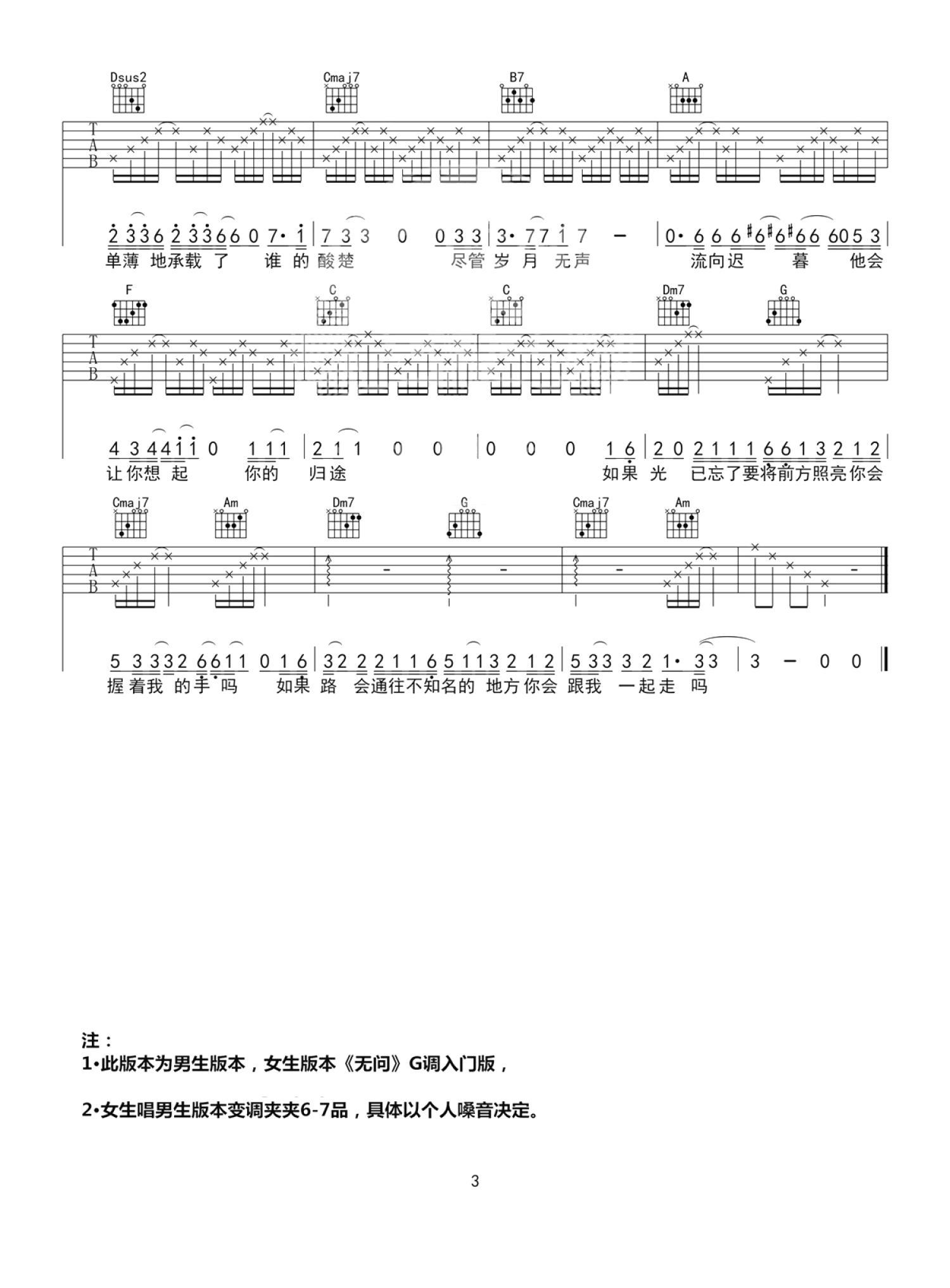 曲谱介绍: 毛不易《无问》吉他谱,C调标准版男生弹唱谱,降半音调弦。女生如果弹唱可以使用变调夹夹6-7品,这首《无问东西》电影宣传曲由毛不易作词作曲,献给每一个珍贵的你,轻柔的旋律,有故事的歌词,配上深情暖心的轻轻诉说,让人忆起那些被遗忘的过往,和那不曾示人的感伤。