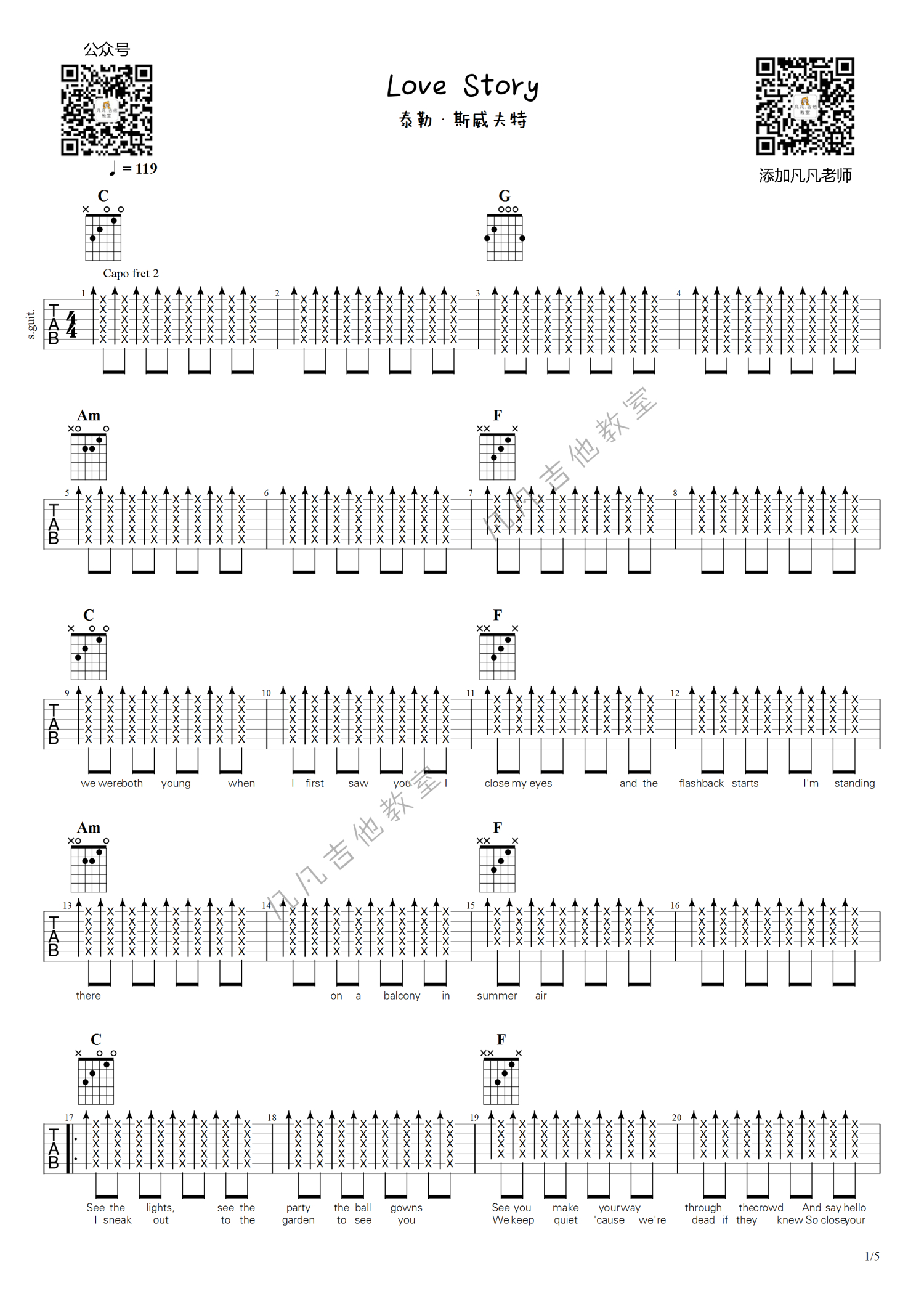 曲谱介绍: 泰勒斯威夫特「love story」吉他弹唱。青春有你、乡村音乐霉霉Taylor Swift,回忆杀翻唱。闷音扫弦免费吉他谱,罗密欧朱丽叶浪漫爱情。爷青回初中高中大学生「凡凡吉他教室编配」