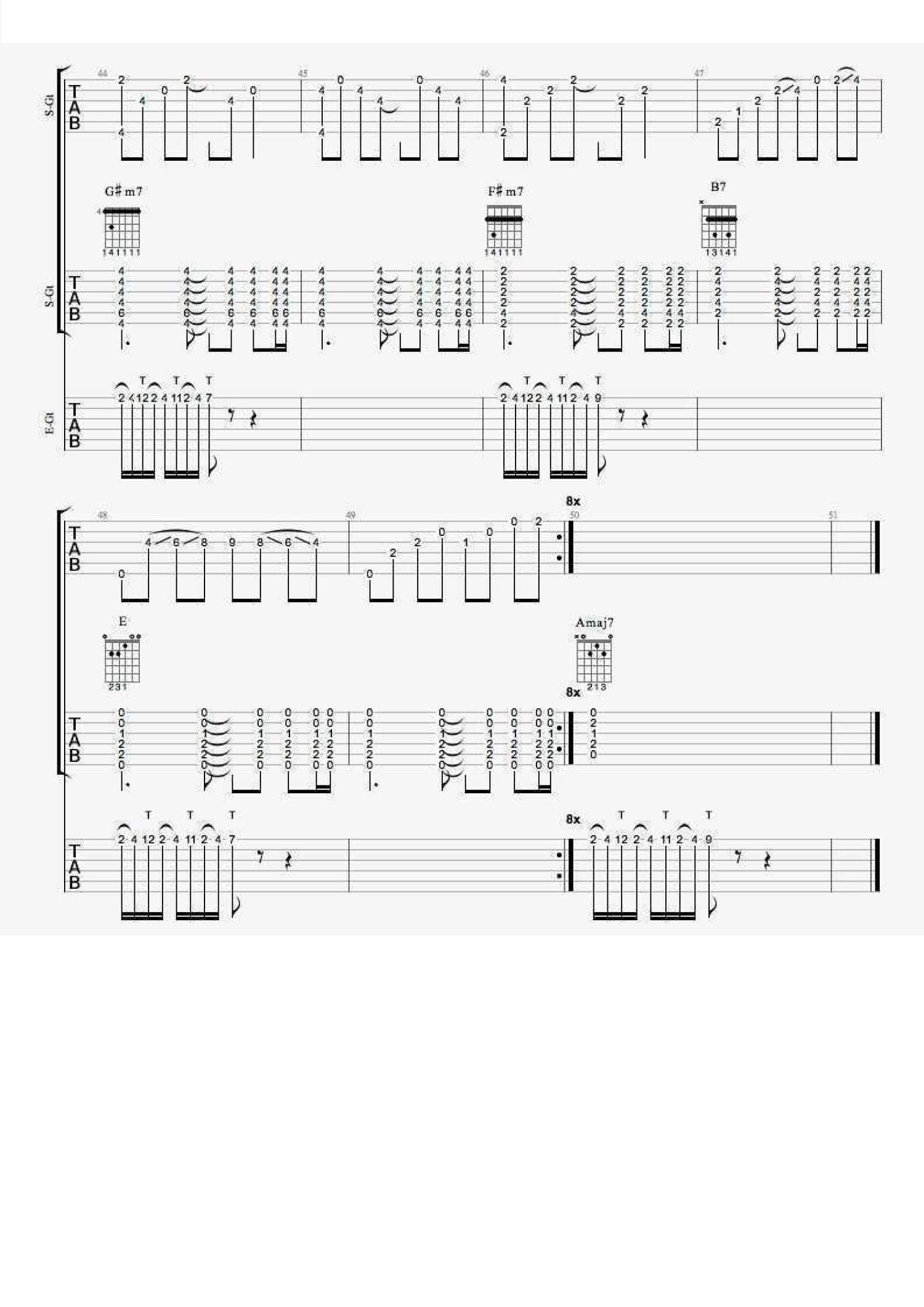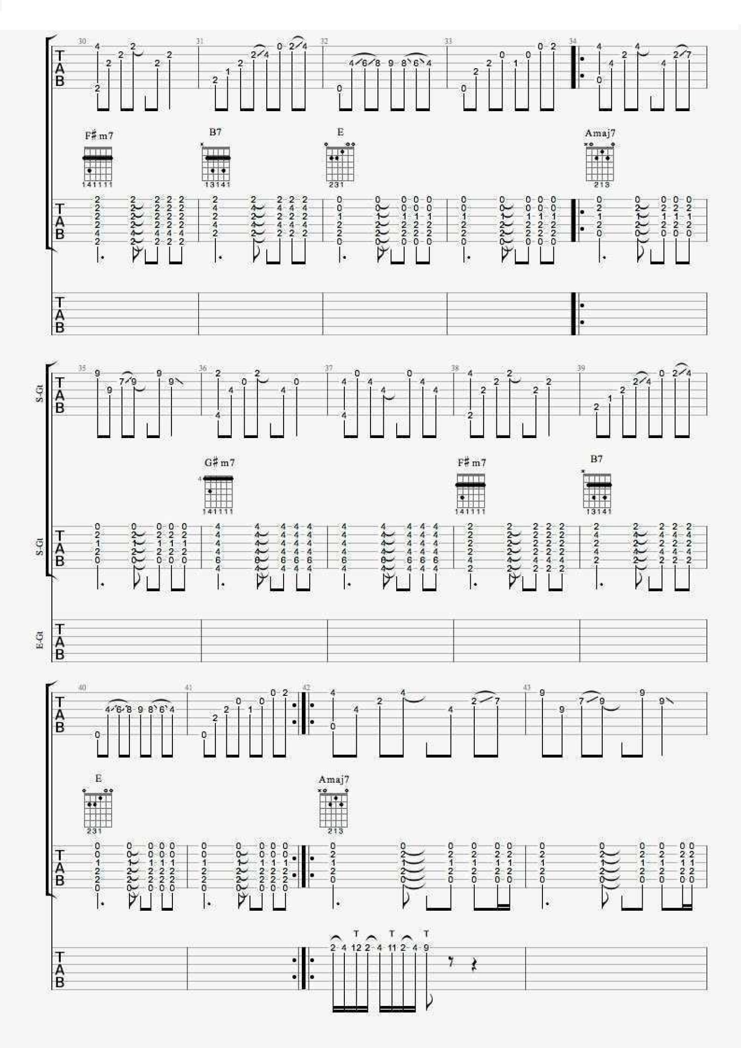 曲谱介绍: 一首纯音乐作品,没有歌词,每个吉他声部单独独立出来都会感觉单薄和单调,所以在吉他谱中扒了三个声部的吉他,如果喜欢这首歌,可以找几个小伙伴一起练习:声部一是指弹吉他,声部二是扫弦伴奏吉他,声部三是电吉他solo。     这首歌的结构并不复杂,全部是八小节的循环,和弦是:Amaj7-G#m7-F#m7-B7-E。指弹声部的吉他也是围绕这几个和弦编配的,需要注意的是Amaj7和G#m7这两部分的和弦指法不同于扫弦的指法,需要特殊练习,此外在这个声部中有大量滑弦的技巧,弹奏的时候要注意节奏的稳定。     扫弦声部的吉他随着音乐的递进节奏逐渐丰富,但是只要把切分掌握好就可以自由变换扫弦。电吉他声部Solo使用了右手点弦技巧,还加入了延时效果器。