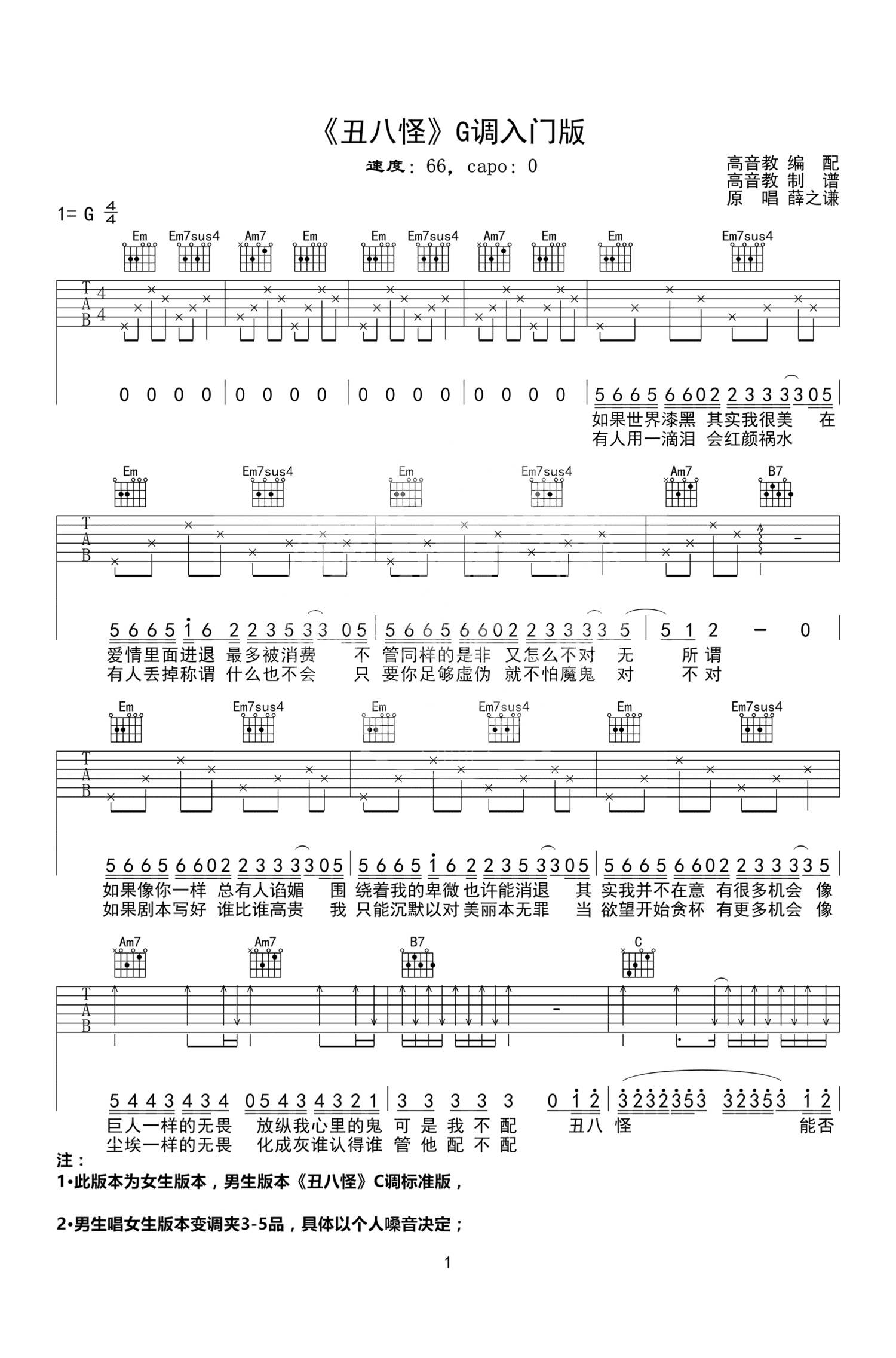曲谱介绍: 丑八怪吉他谱,G调入门弹唱谱,女生版编配,男生可以使用变调夹夹3-5品,薛之谦演唱的代表作品,随谱附上曲谱配套吉他弹唱教学视频,琴友们跟随老师的讲解示范练习。
