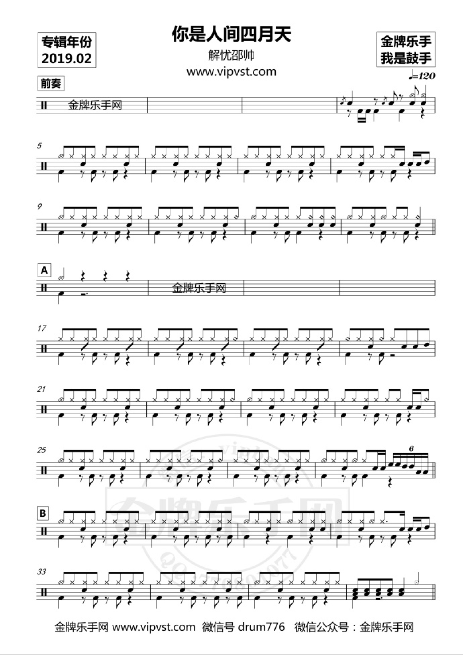 曲谱介绍: 解忧邵帅《你是人间四月天》鼓谱_架子鼓谱