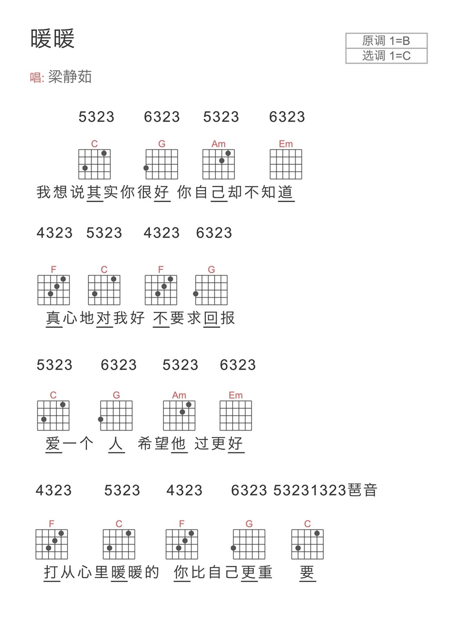 曲谱介绍: 梁静茹《暖暖》吉他谱_C调吉他弹唱谱_和弦谱 片段