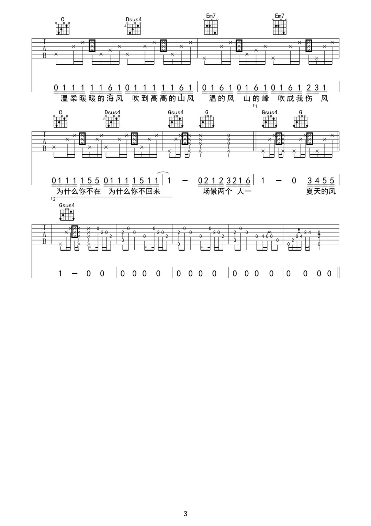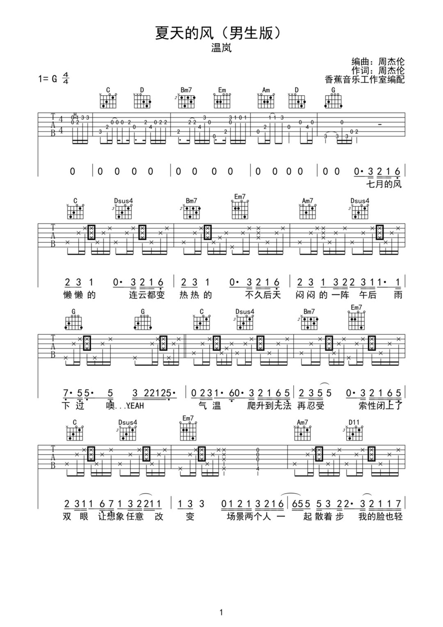 曲谱介绍: 温岚《夏天的风》吉他谱_G调吉他弹唱谱_男生版