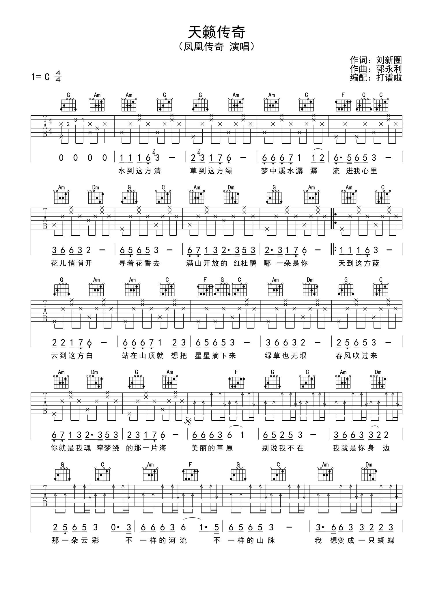 曲谱介绍: 凤凰传奇《天籁传奇》吉他谱_C调吉他弹唱谱