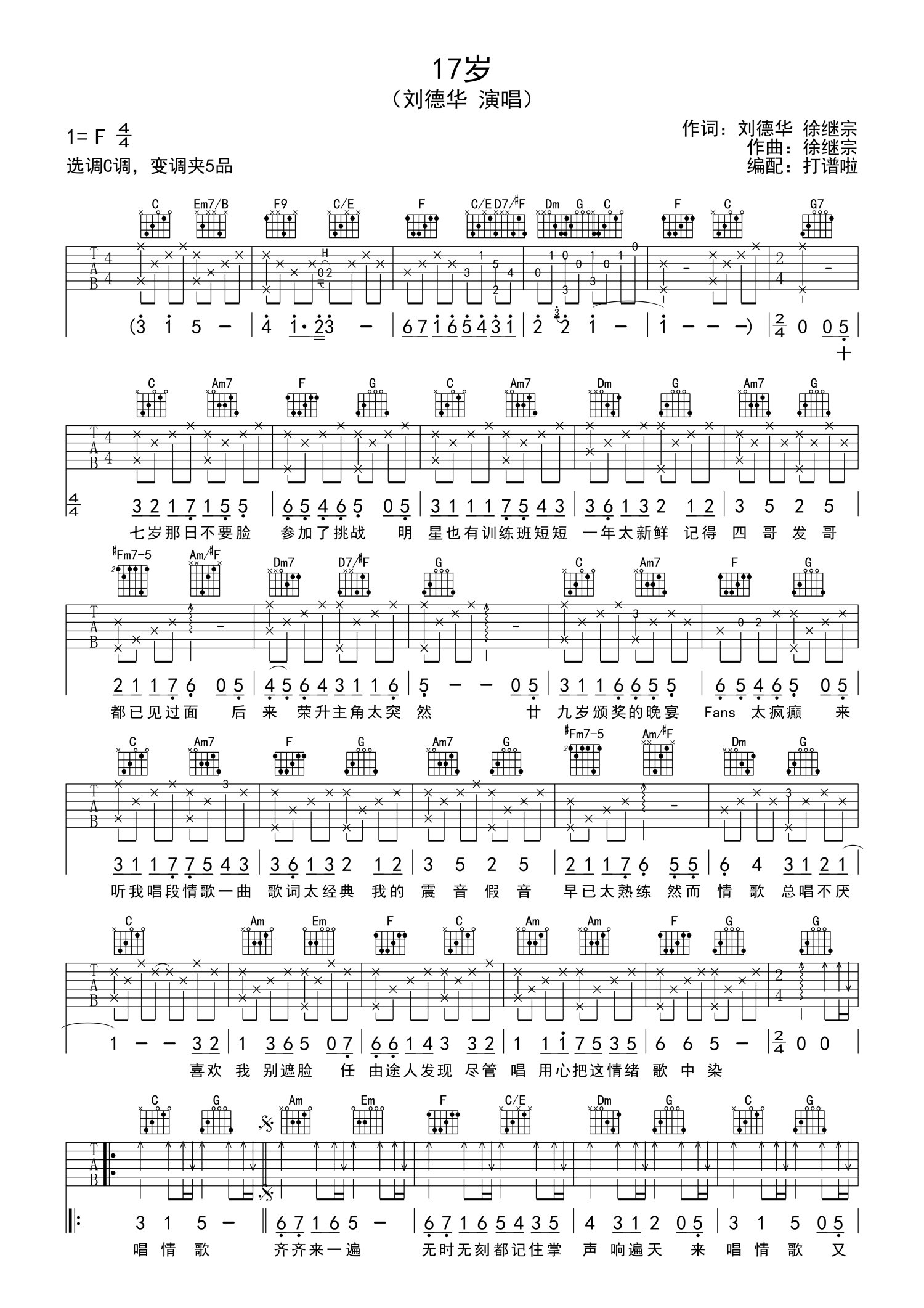 曲谱介绍: 刘德华《17岁》吉他谱_C调吉他弹唱谱