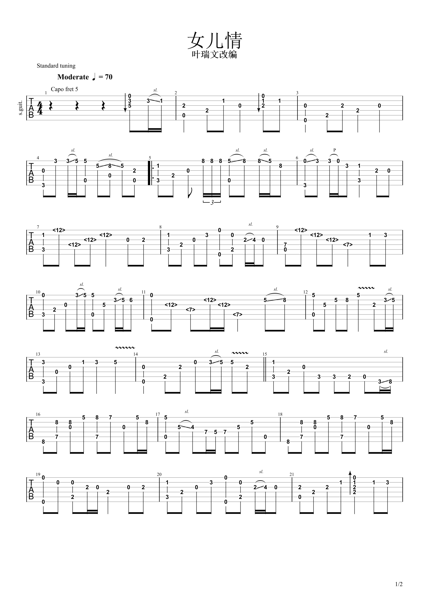 • 女儿情吉他谱 - 叶锐文 - C调吉他独奏谱第1张