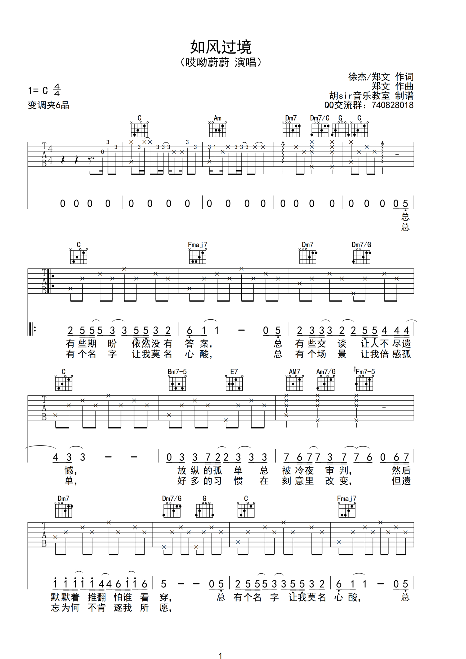 • 如风过境吉他谱 - 哎哟蔚蔚 - C调吉他弹唱谱第1张