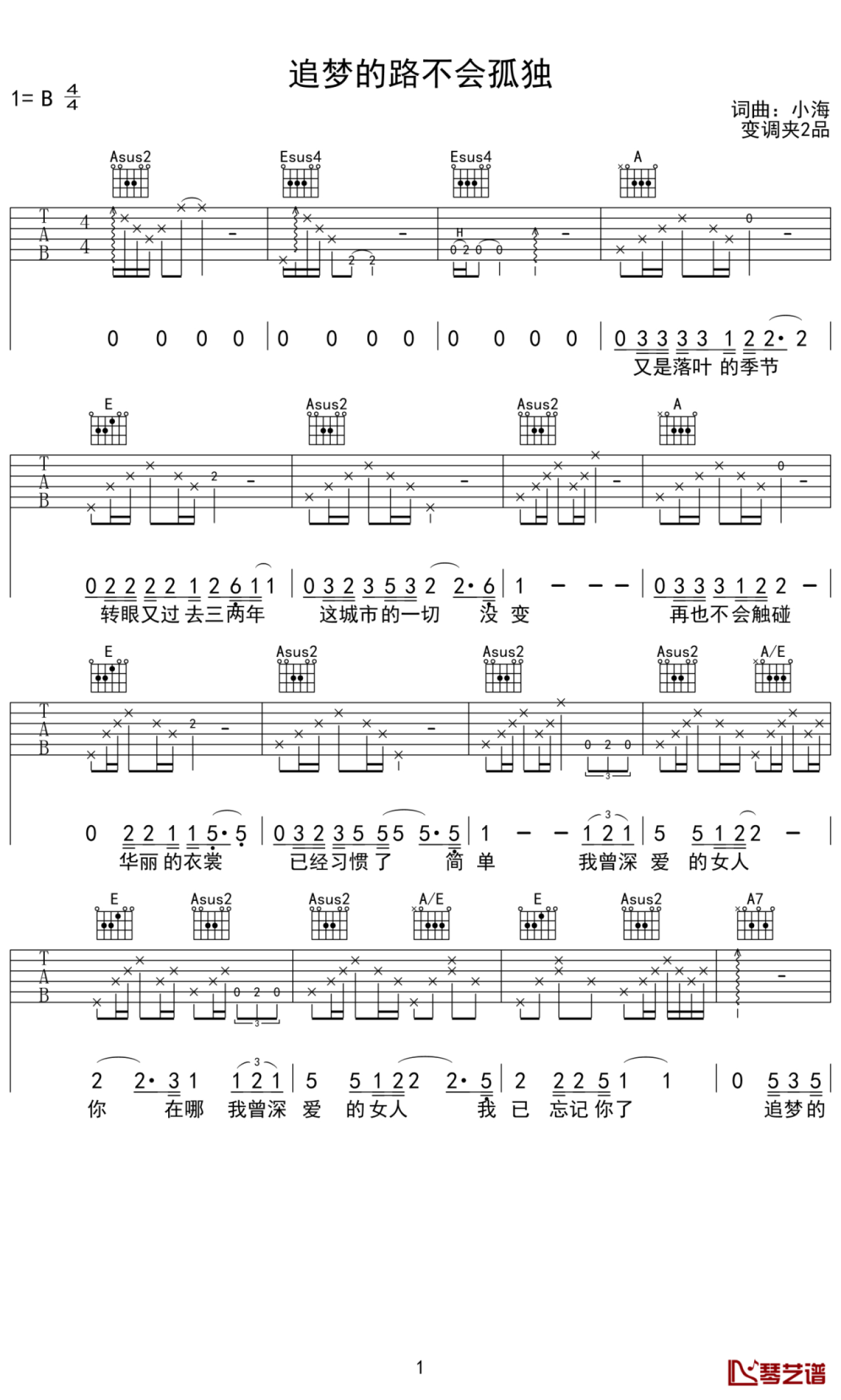 曲谱介绍: 小海《追梦的路不会孤独》吉他谱_B调吉他弹唱谱