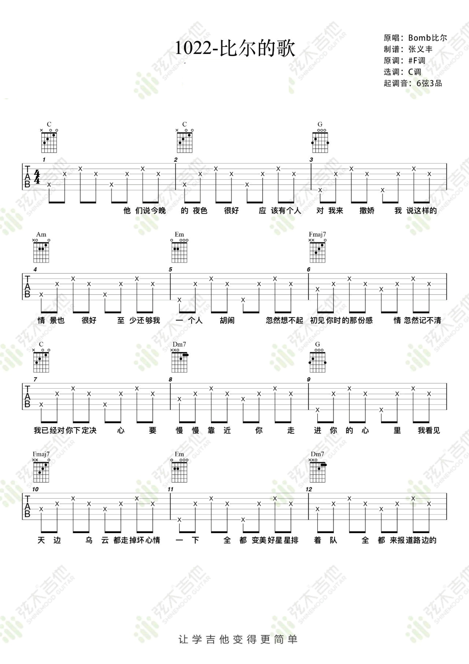 1022-比尔的歌吉他谱 - Bomb比尔 - G调吉他弹唱谱 - 抖音热门歌曲