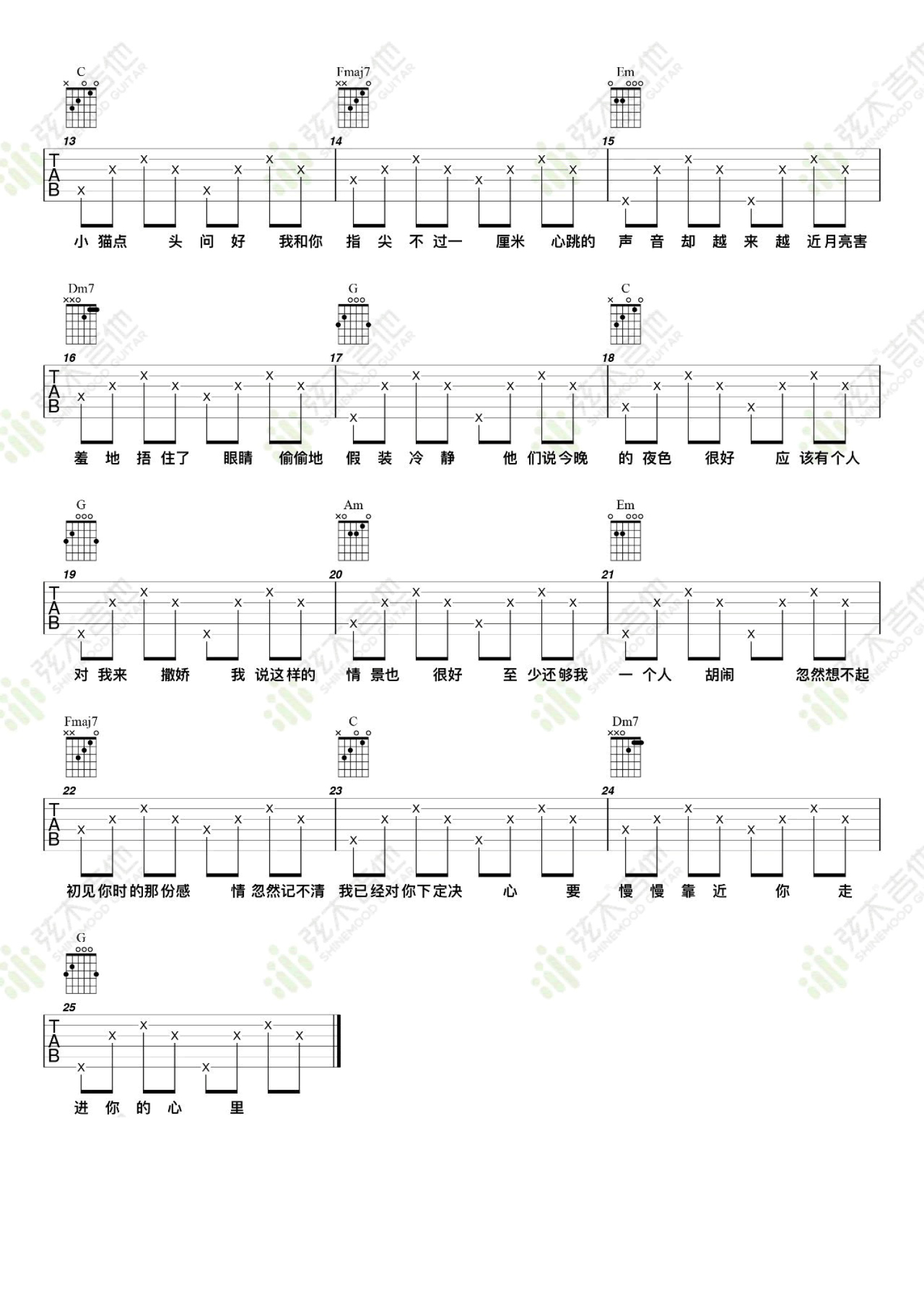 曲谱介绍: 一首抖音大火歌曲。1022吉他弹唱谱,原调升F,选用C调,起调音6弦3品,曲调欢快,充满两情相悦的恋爱气息。R&B旋律做基底,搭配用慵懒的声线和Hiphop的律动,让整首歌曲旋律流畅顺滑。仿佛微凉的夜晚,温暖羞涩的男孩和心仪的女生约会,不需要任何言语,嘴角已不经意地默契上扬。
