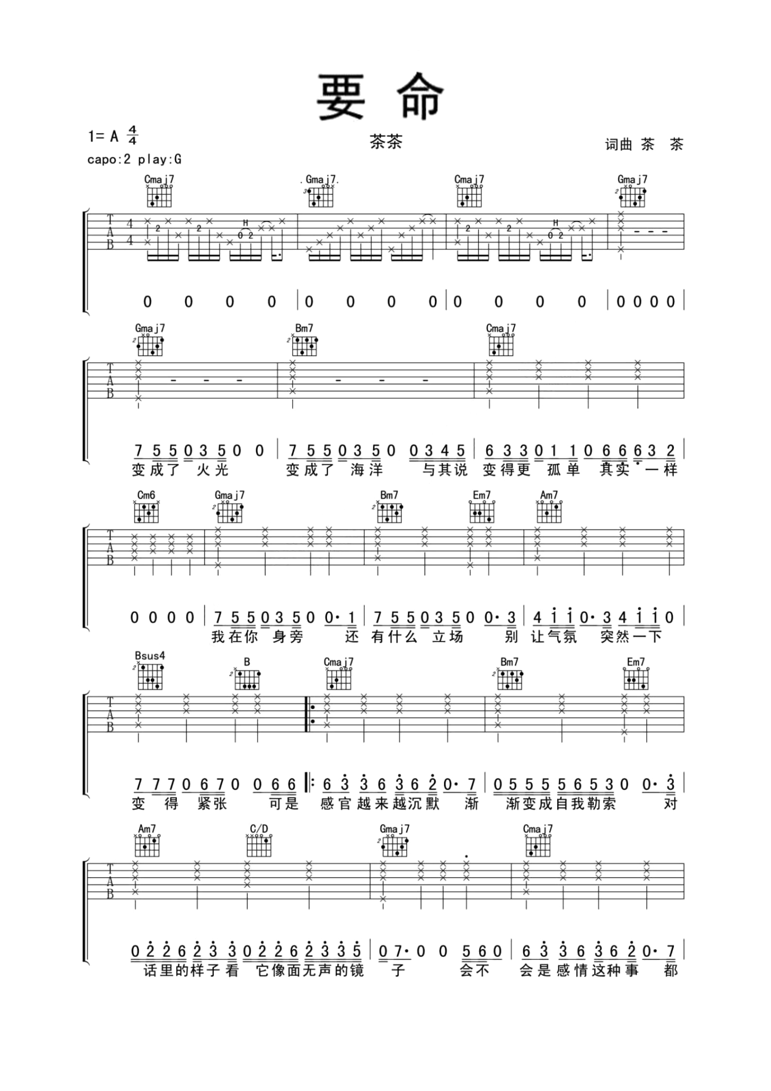 曲谱介绍: 茶茶《要命》吉他谱_G调吉他弹唱谱