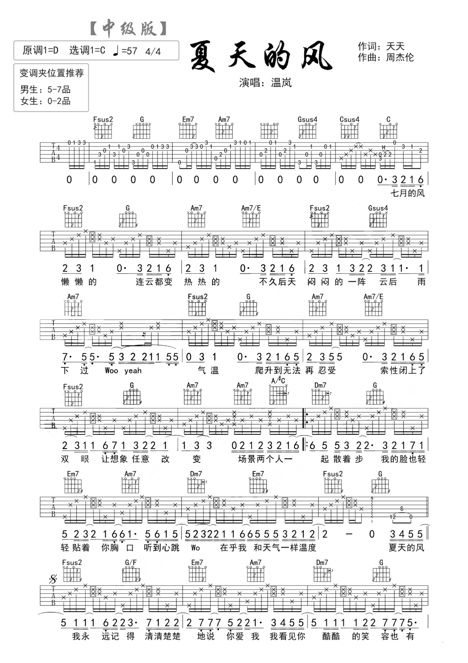 曲谱介绍: 温岚《夏天的风》吉他谱_C调吉他弹唱谱