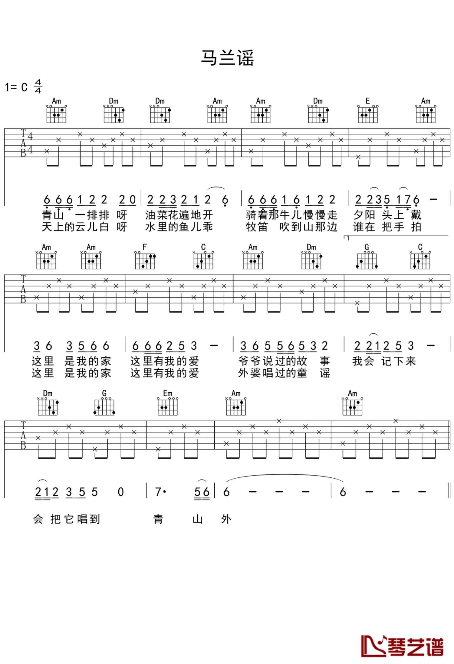 曲谱介绍: 儿歌《马兰谣》吉他谱_C调吉他弹唱谱