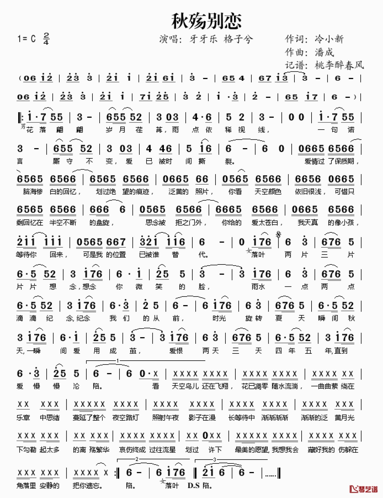 曲谱介绍: 牙牙乐/格子兮《秋殇别恋》歌词_简谱