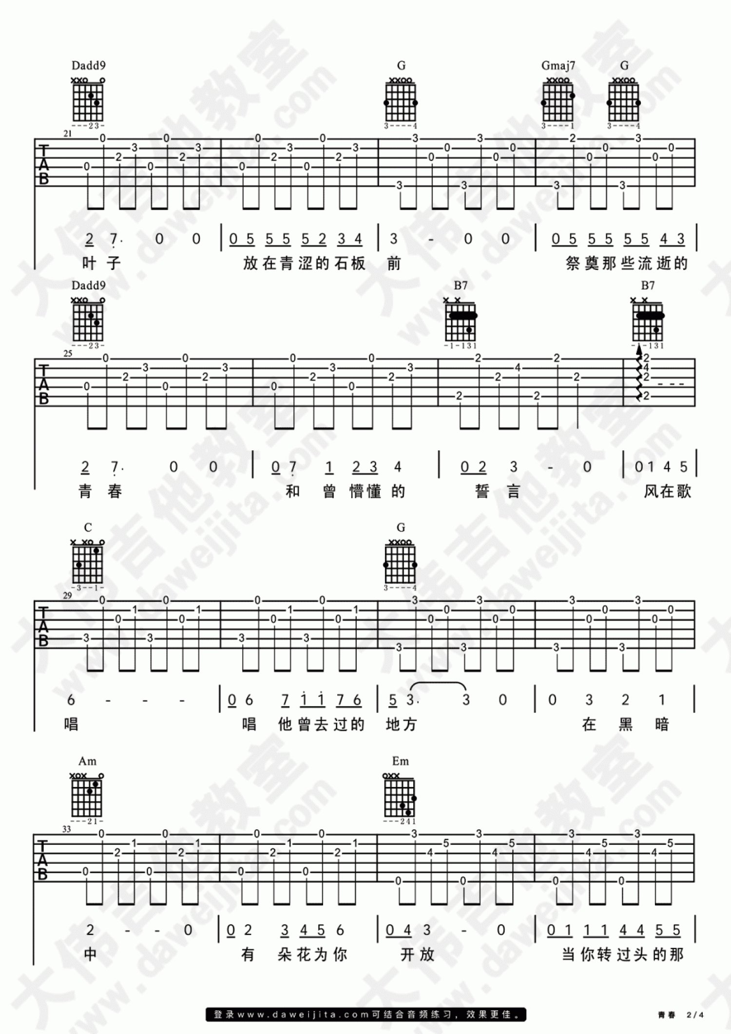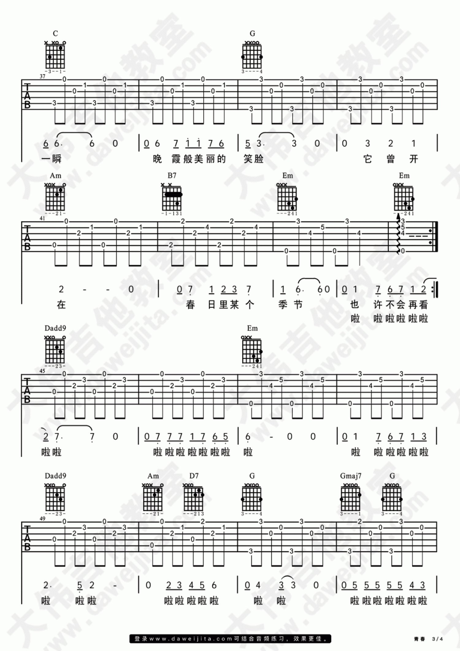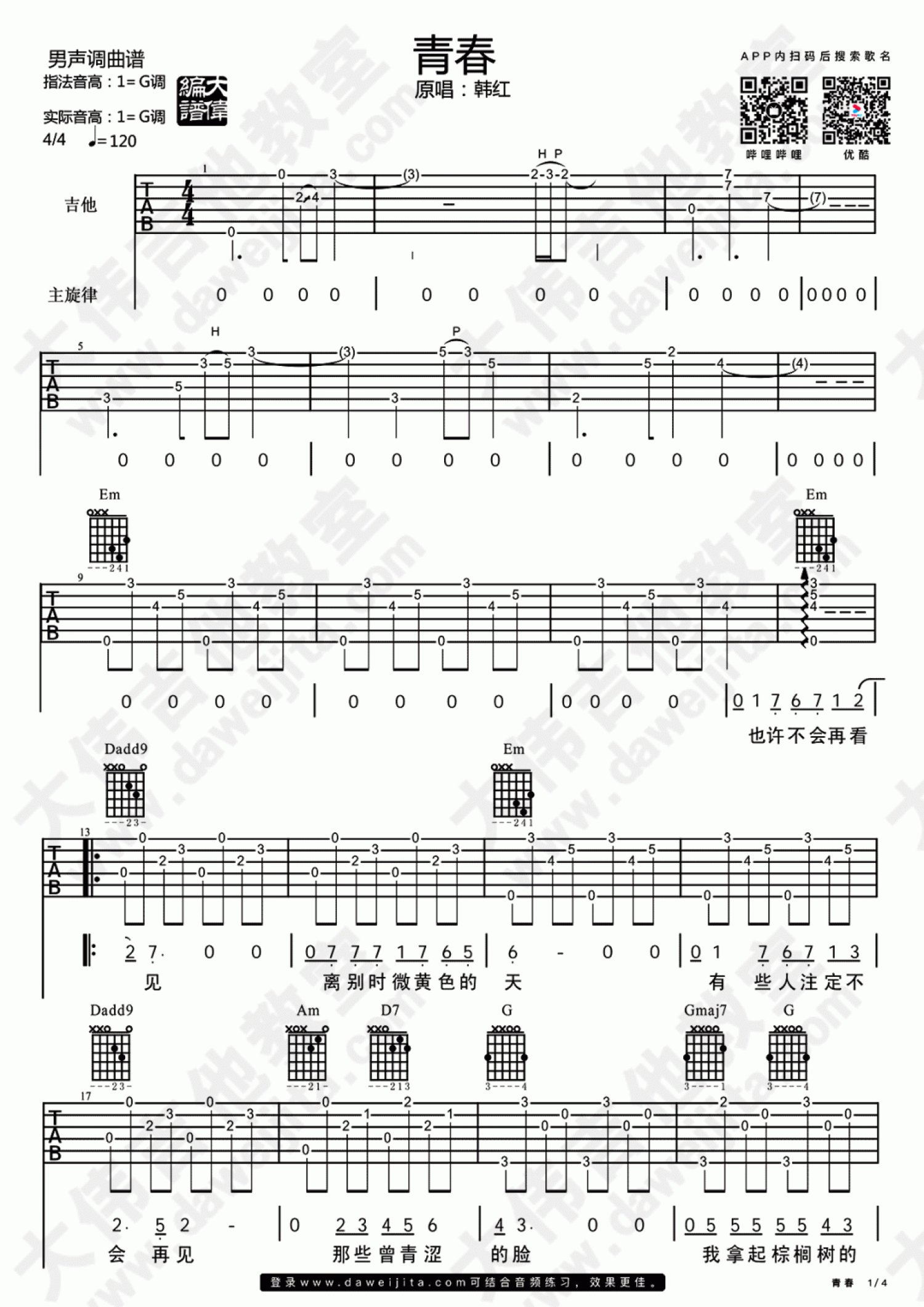 曲谱介绍: 韩红《青春》吉他谱_G调吉他弹唱谱