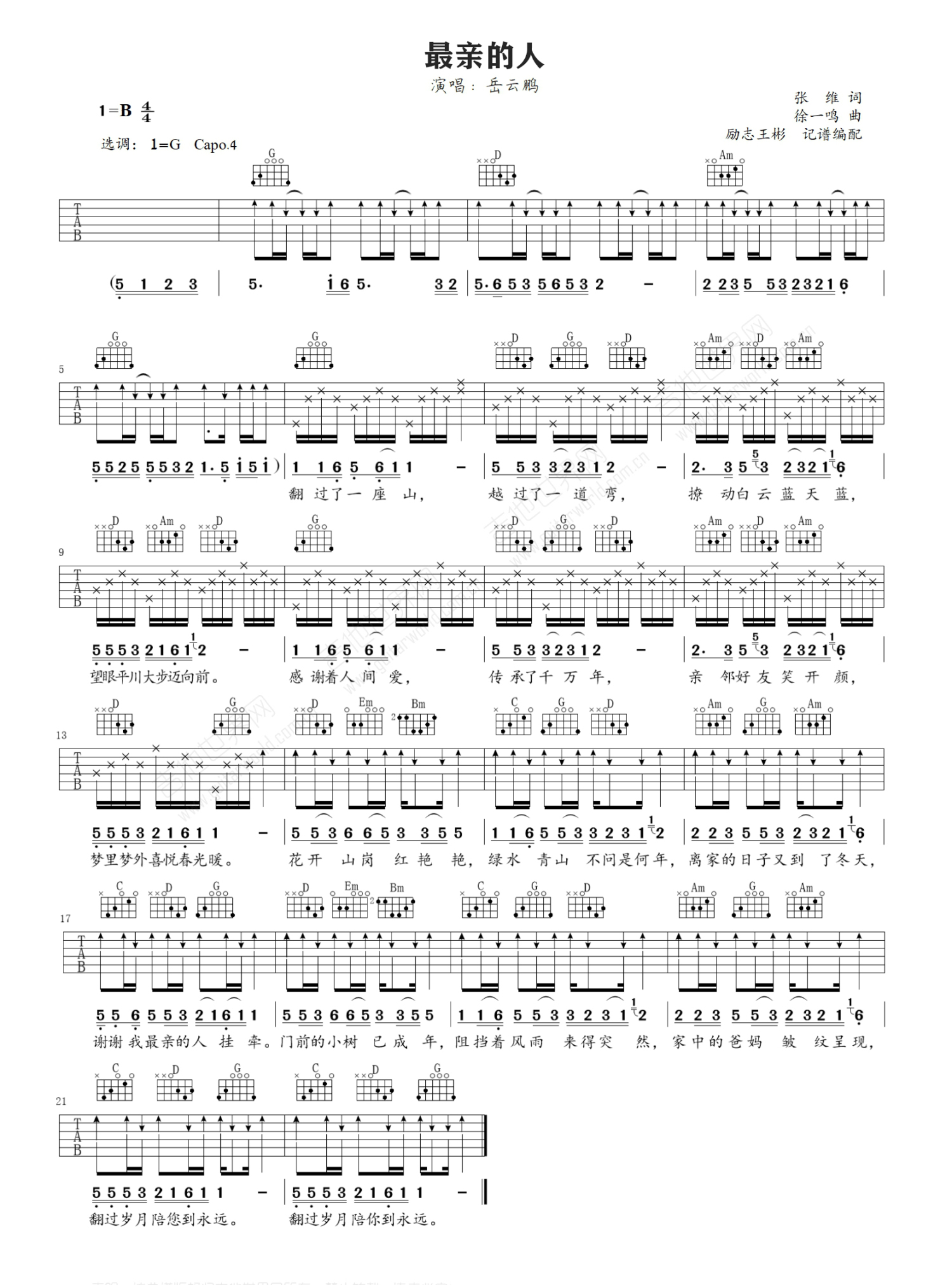 曲谱介绍: 最亲的人吉他谱,陆海涛演唱,岳云鹏在2021年央视春晚上翻唱,给人以欢乐和力量,收获众多听众的喜欢。最亲的人吉他弹唱谱,G调指法编配,变调夹夹第四品,相声演员岳云鹏凭一己之力干掉所有专业歌手,把《最亲的人》唱成2021年最火神曲。歌曲诙谐幽默积极向上,以极易传唱的曲调和写实动人的歌词传达节日喜乐,带给了听众满满的欢乐和正能量。