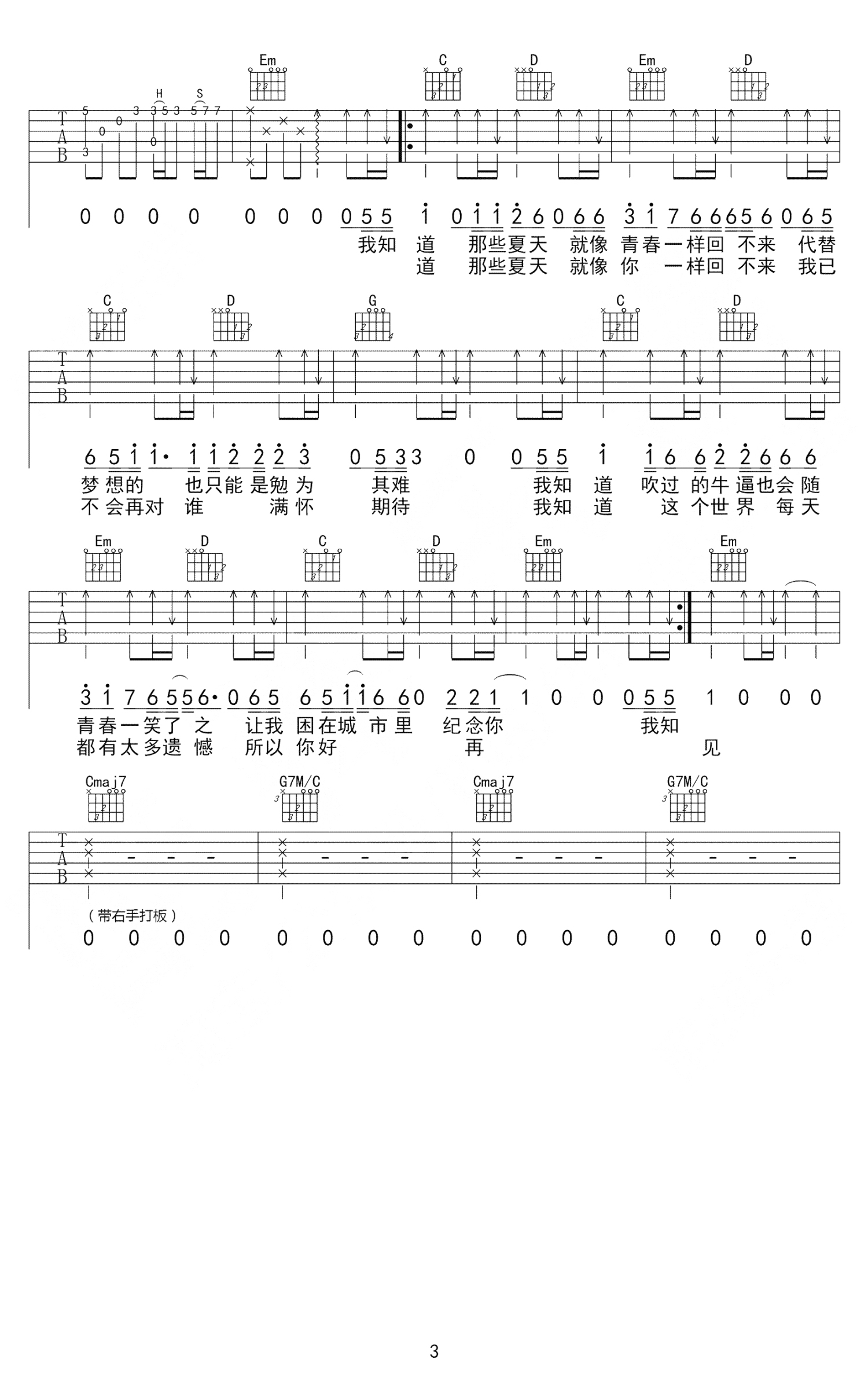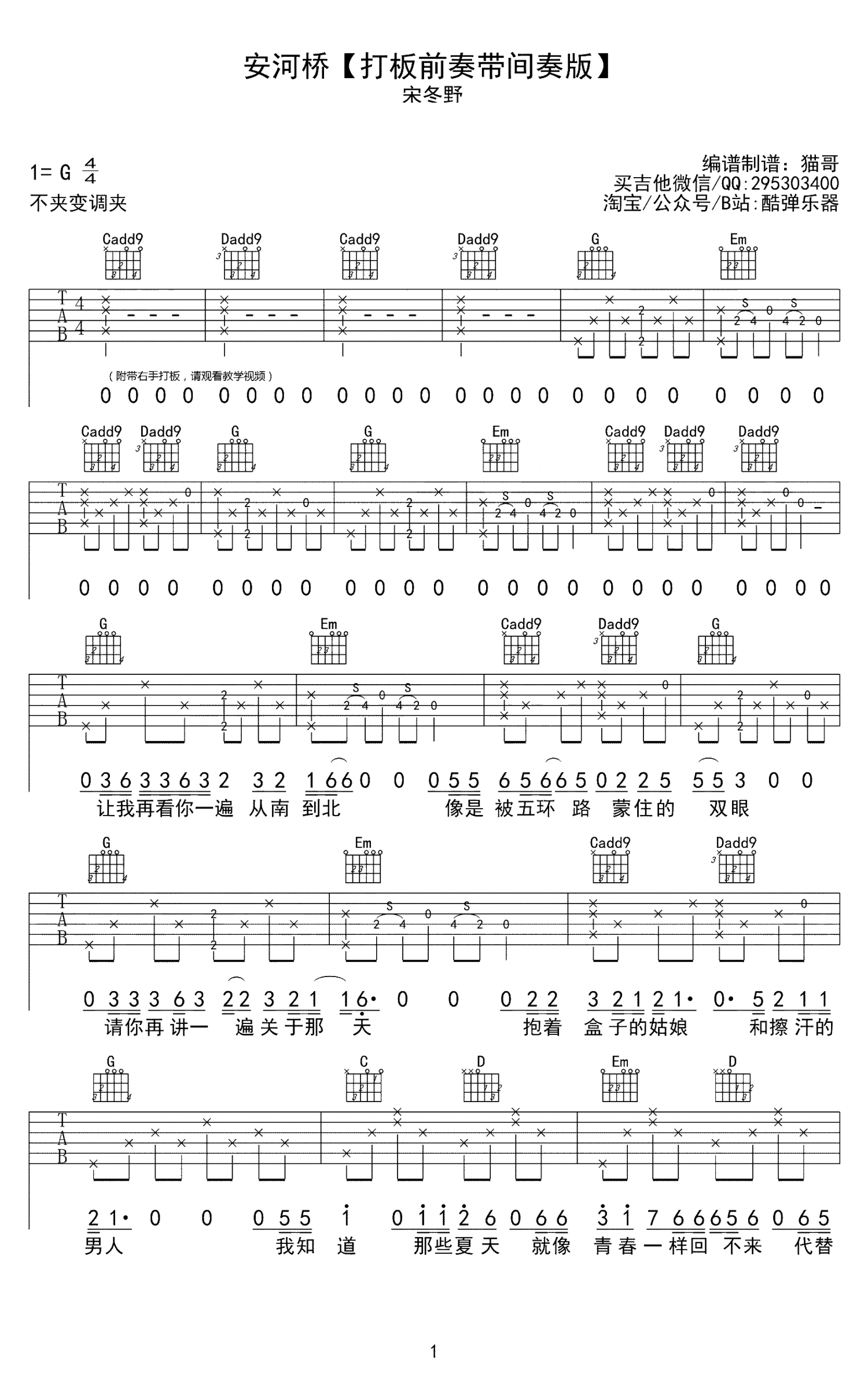 曲谱介绍: 宋冬野《安河桥》吉他谱_G调吉他弹唱谱_打板前奏带间奏版