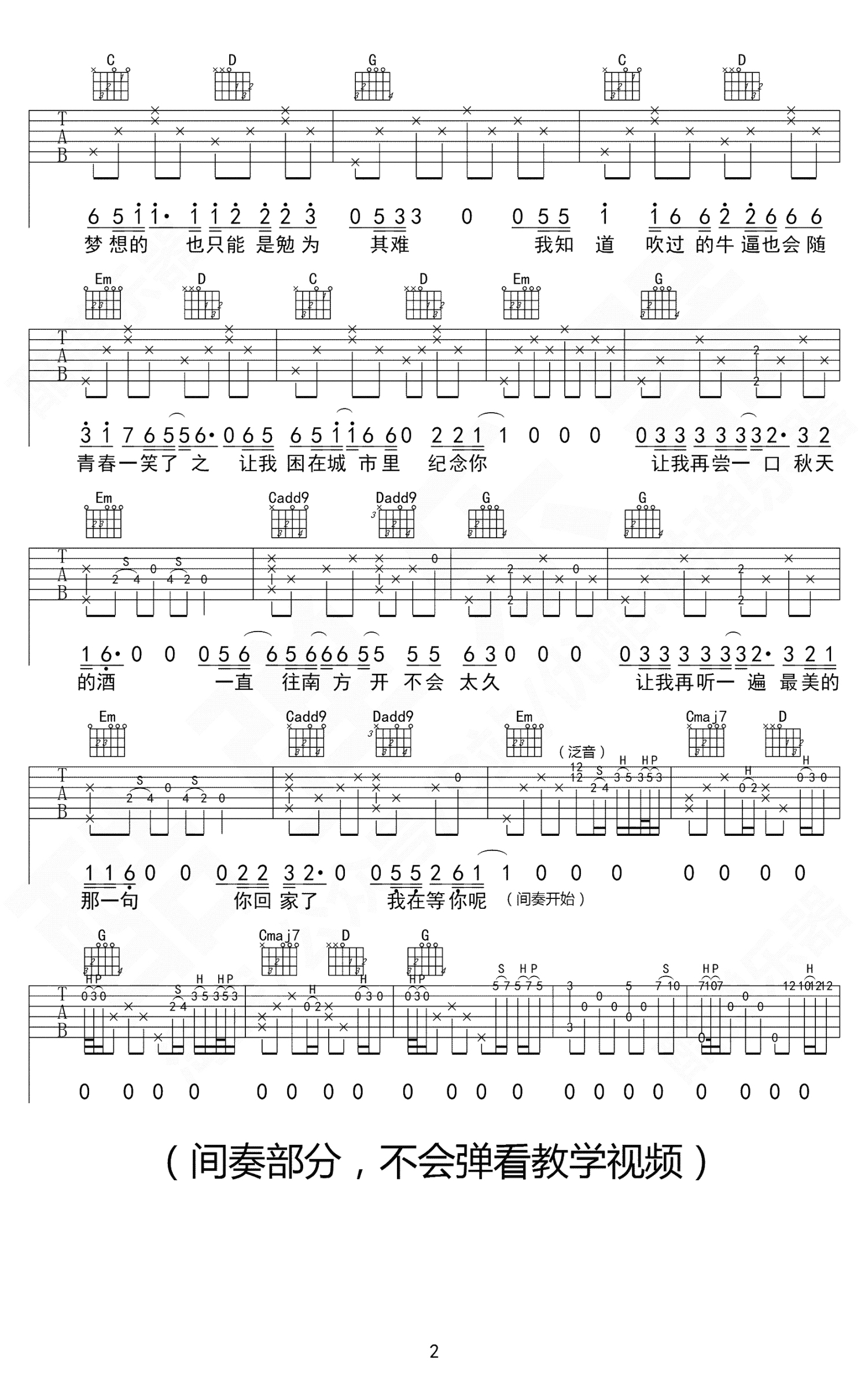 安河桥吉他谱 - 宋冬野 - G调吉他弹唱谱 - 打板前奏带间奏版