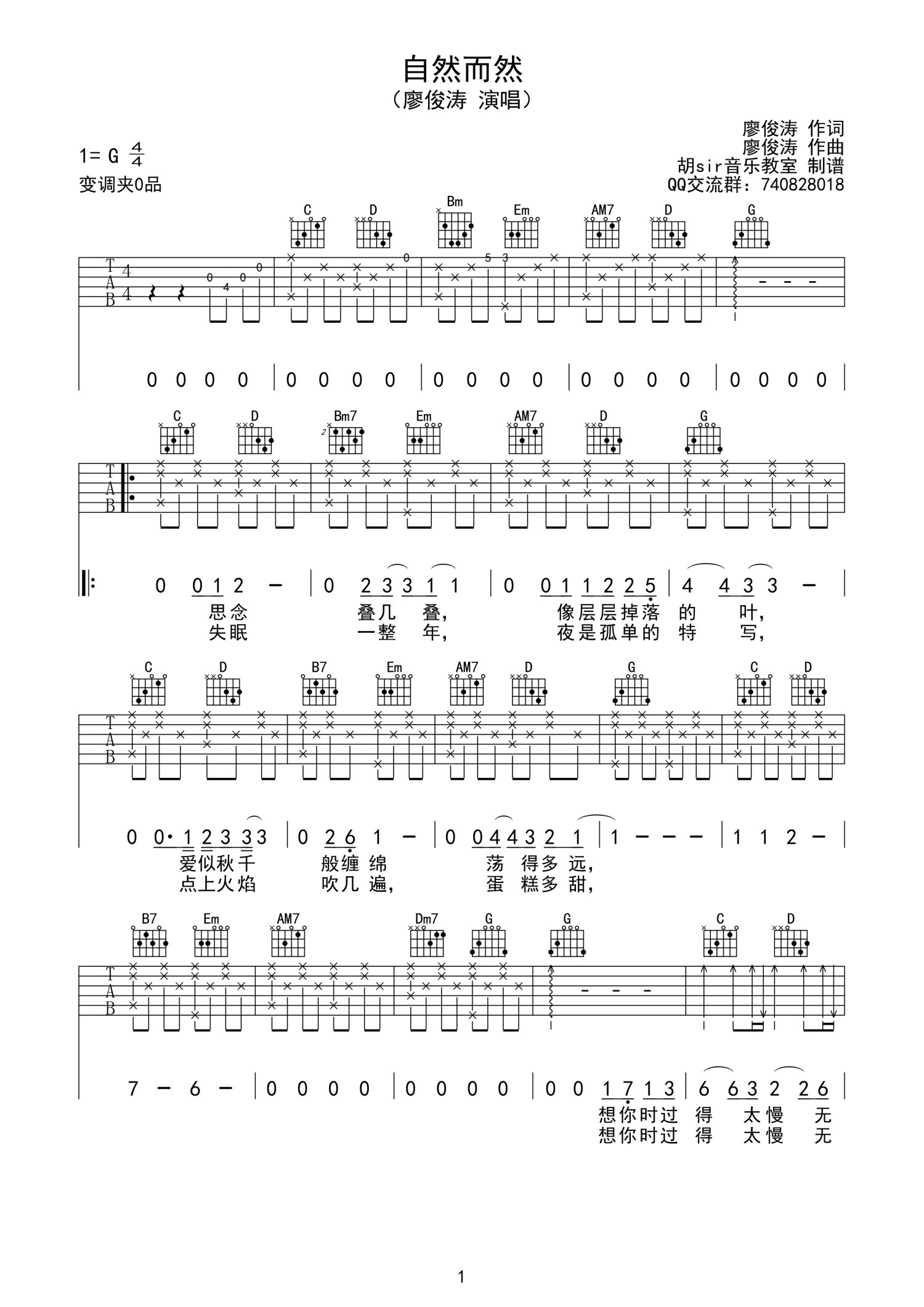 • 自然而然吉他谱 - 廖俊涛 - G调吉他弹唱谱第1张