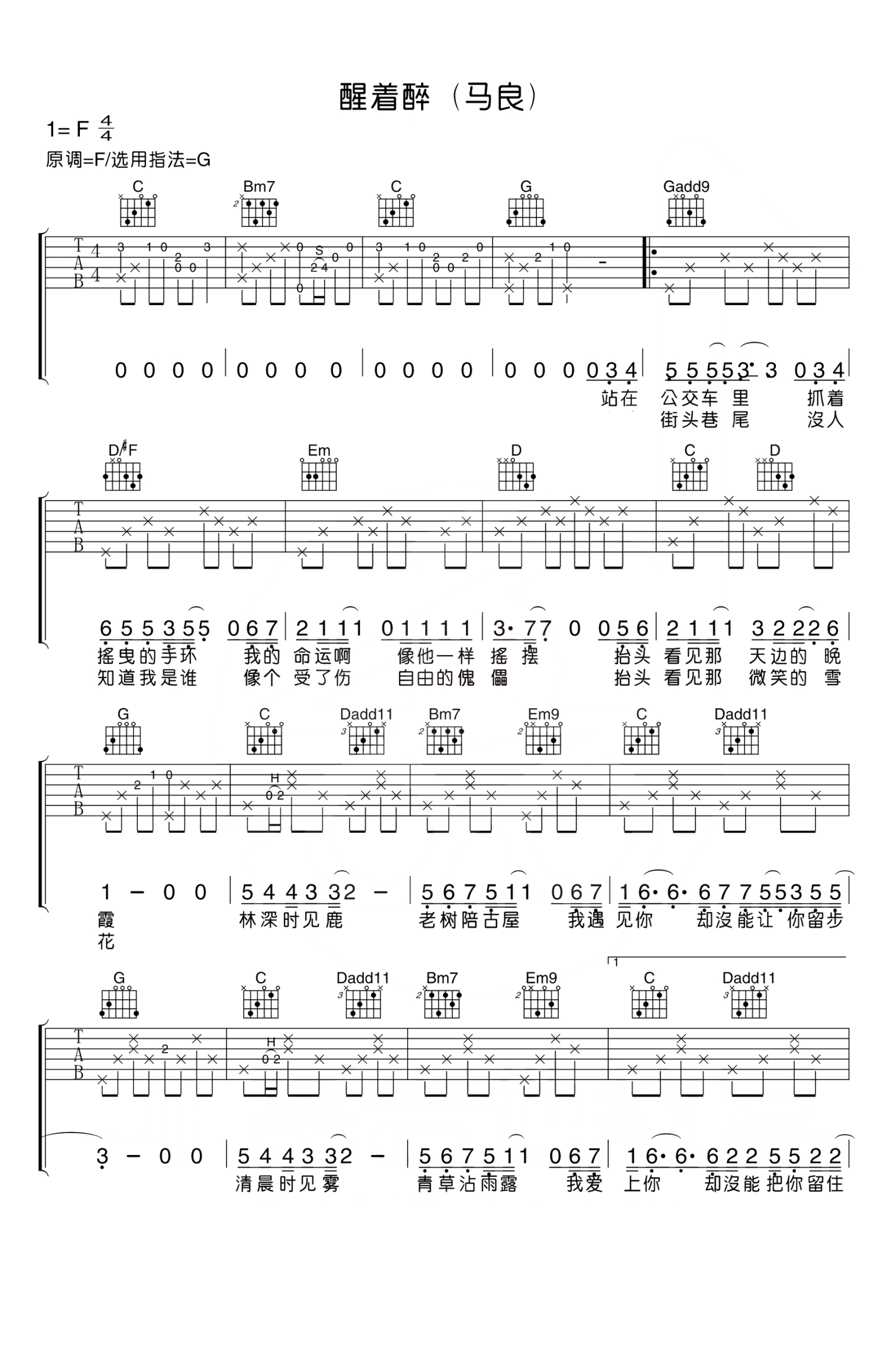 曲谱介绍: 马良《醒着醉》吉他谱,原调F,选用C调指法,关于乐谱与教学!这首歌原版是F调的,所以大家可以在网上看到大量的乐谱是C调指法,变调夹夹在5品的乐谱!这也是目前做乐谱的常态,大家都太固守规则了!老师制作的这个乐谱是G调指法,相比原版的F调属于升了一个整调,但是实际演唱发现,并没有觉得唱不上去,因为原版也不高!我们如果用C调指法,变调夹在5品的话,吉他的声音由于变调夹品位太高,声音注定会很尖锐,所以这里我们用到G调指法,比较合适!乐谱定调直接可以影响一首歌的指法以及和弦编排!不代表原调就是合适的,而要为弹唱服务,只要唱着舒服,其次才要考虑指法调式!这首歌的学习重点在于前奏与间奏,还有一些过门的小细节,整体难度不是很高,歌曲也偏慢速,所以很适合民谣范儿的同学作为小众拿手曲目收藏起来!难度:4级